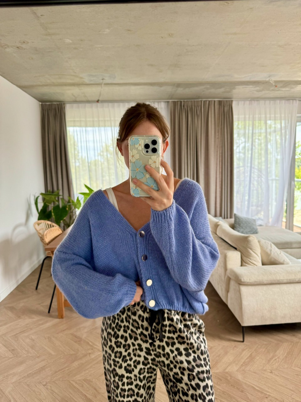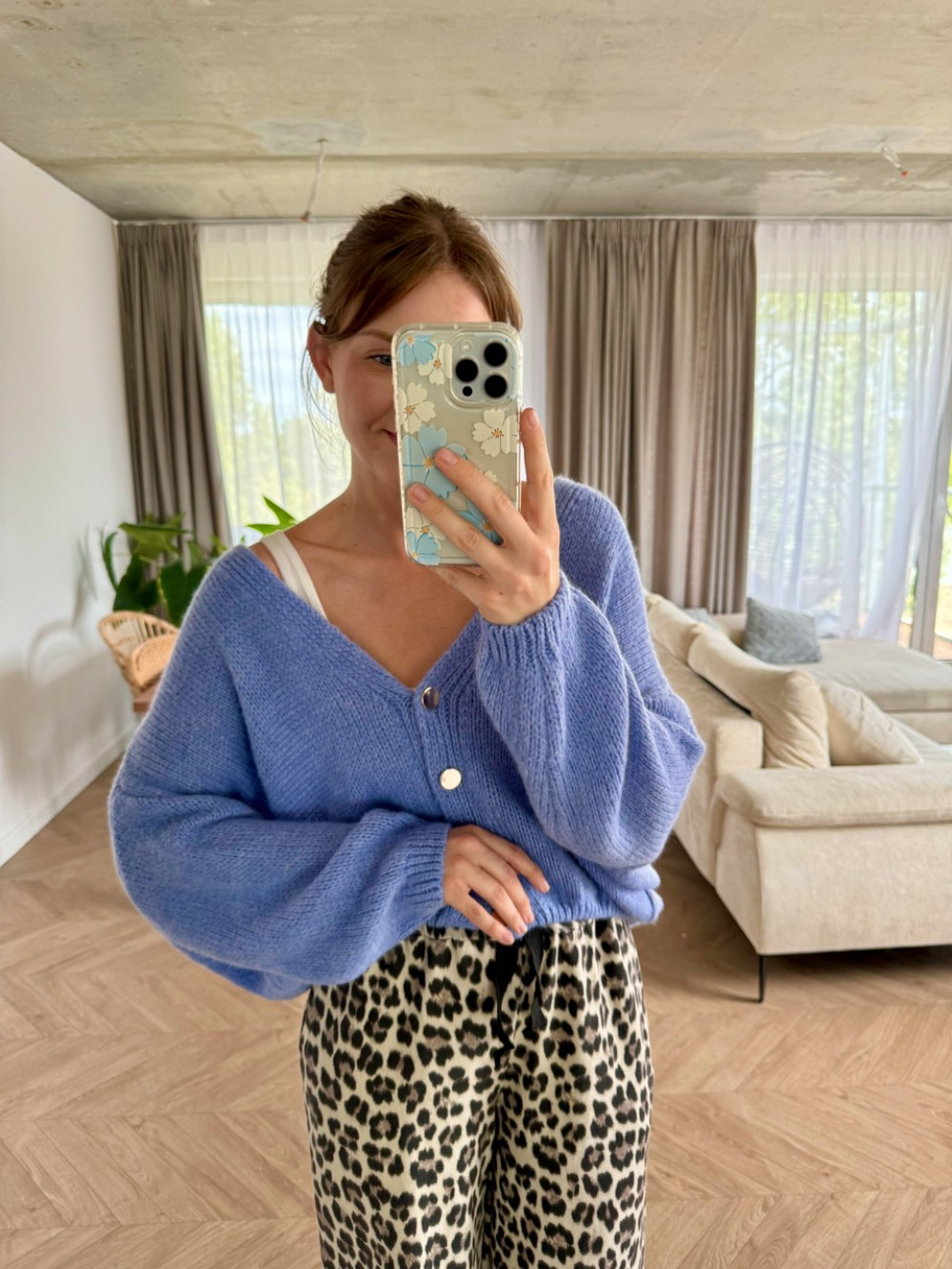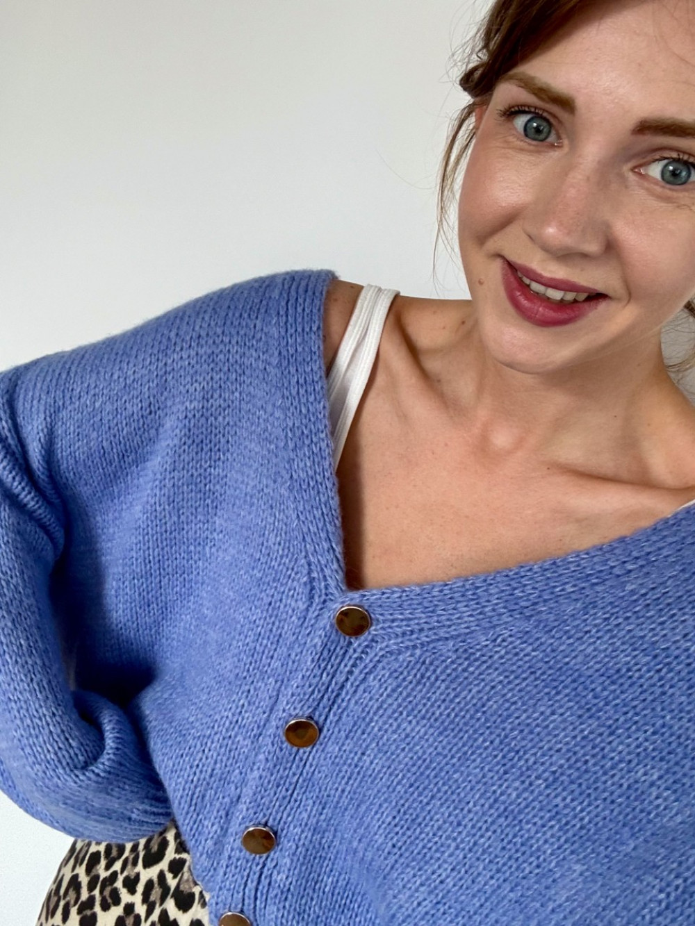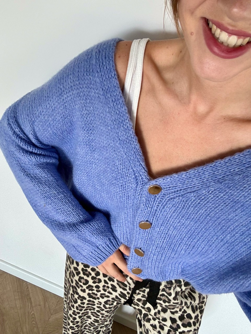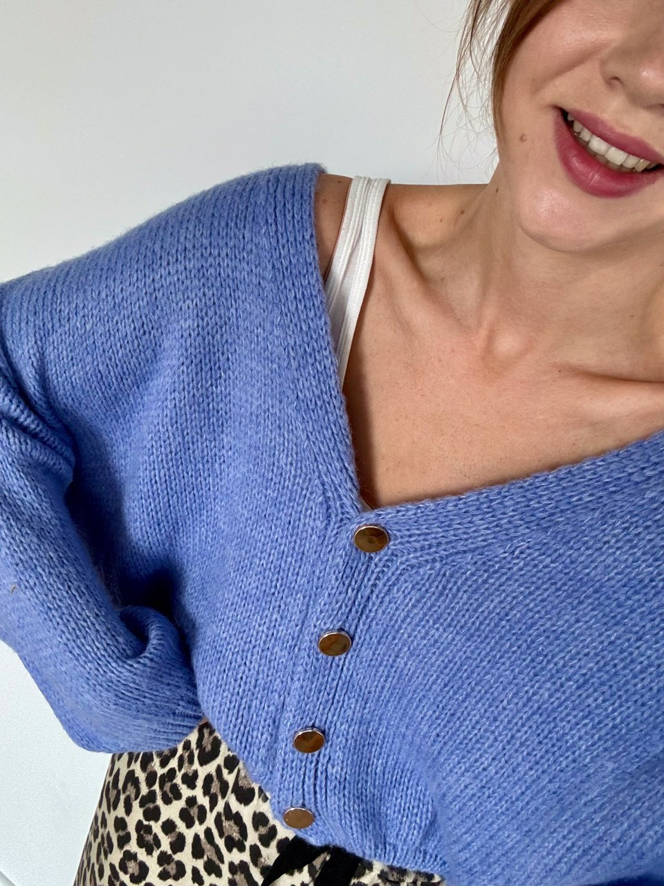 SWETER ROZPINANY ATRAMENTOWY, PUDEŁKOWY FASON Z OZDOBNYM GUZIKIEM LUKRECJA