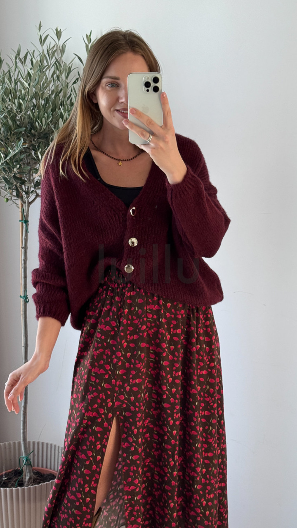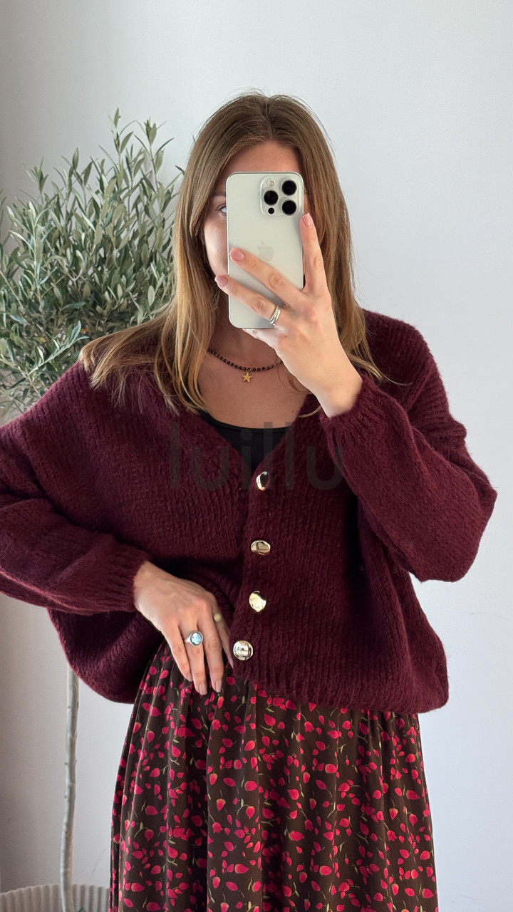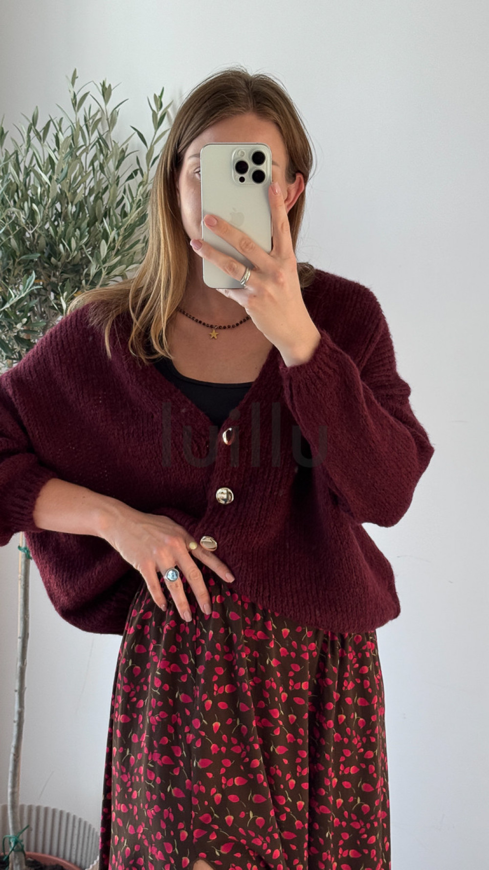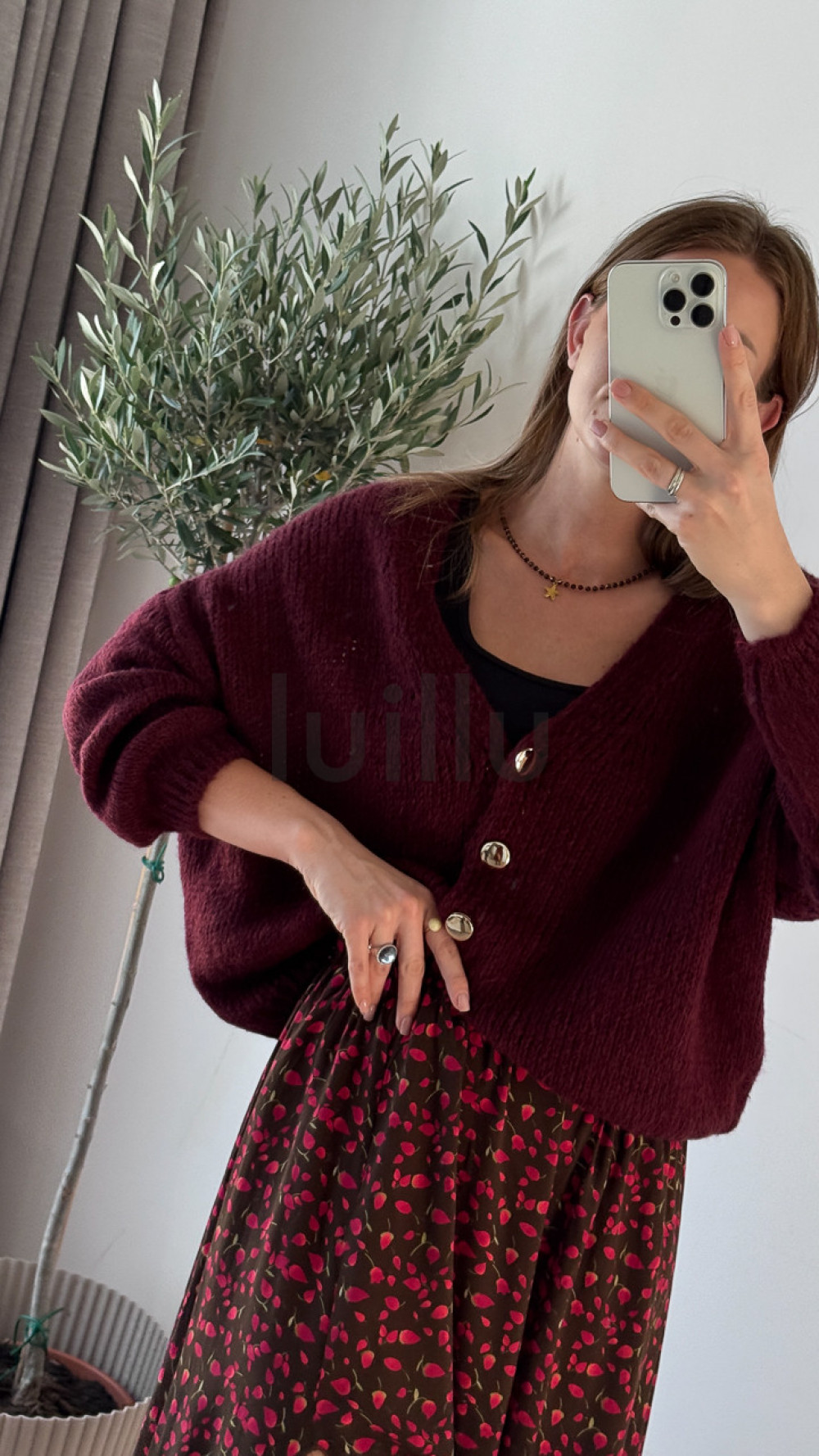 SWETER ROZPINANY BURGUNDOWY PUDEŁKOWY FASON Z OZDOBNYM GUZIKIEM LUKRECJA