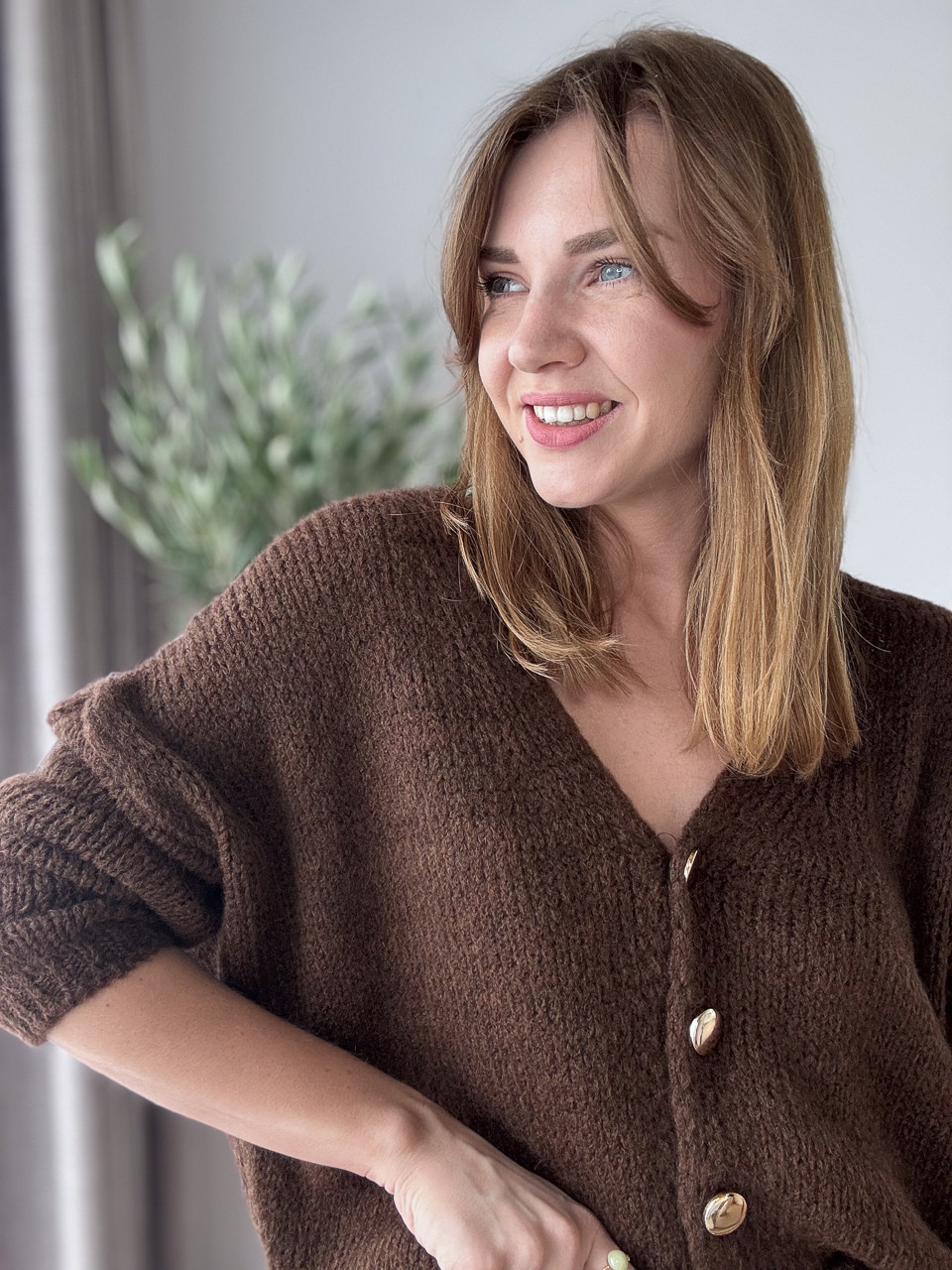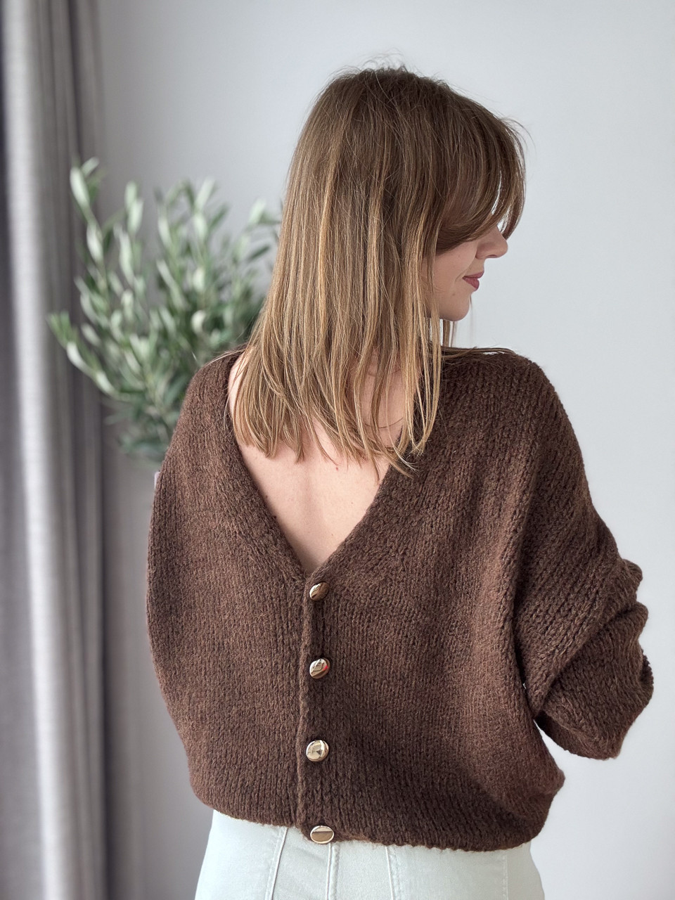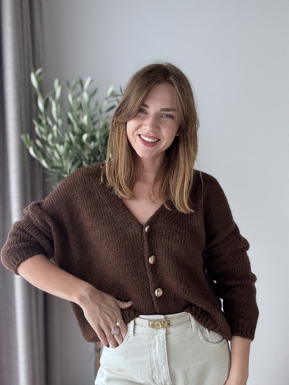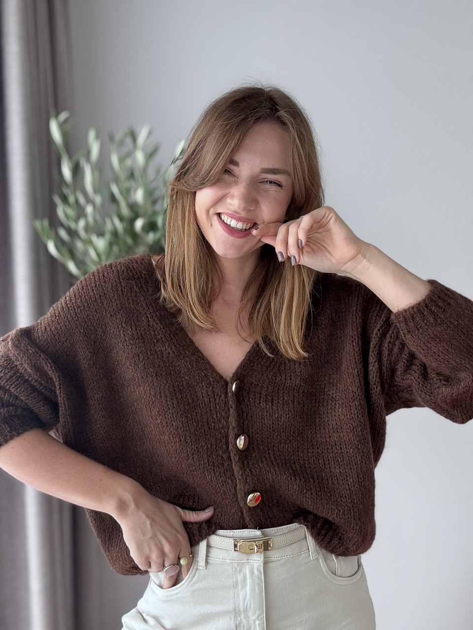 SWETER ROZPINANY CZEKOLADOWY PUDEŁKOWY FASON Z OZDOBNYM GUZIKIEM LUKRECJA