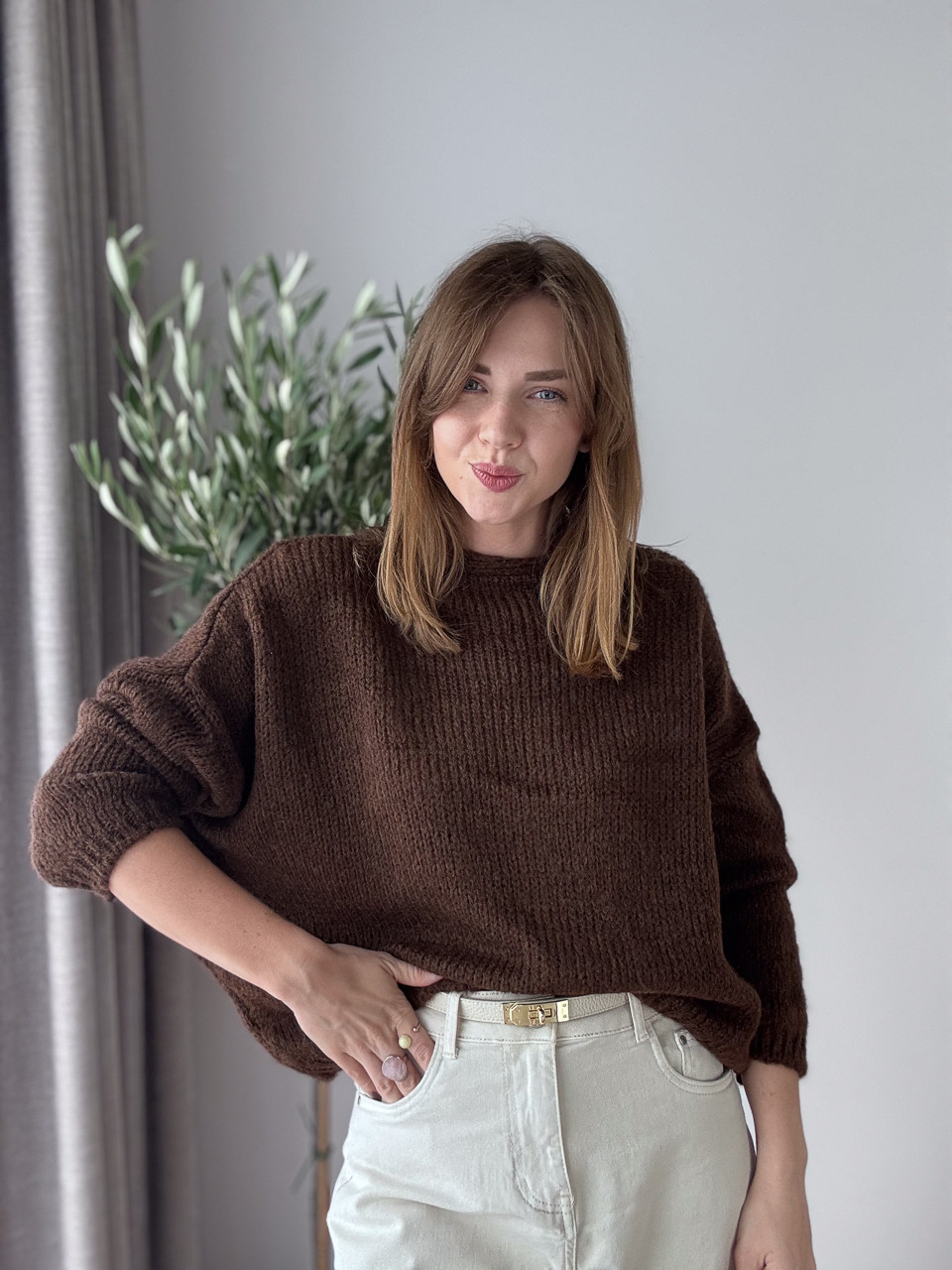 Ten sweter ma luźny, oversizowy fason, co oznacza, że jest nieco większy niż standardowe swetry.