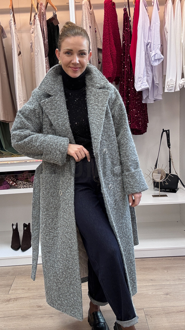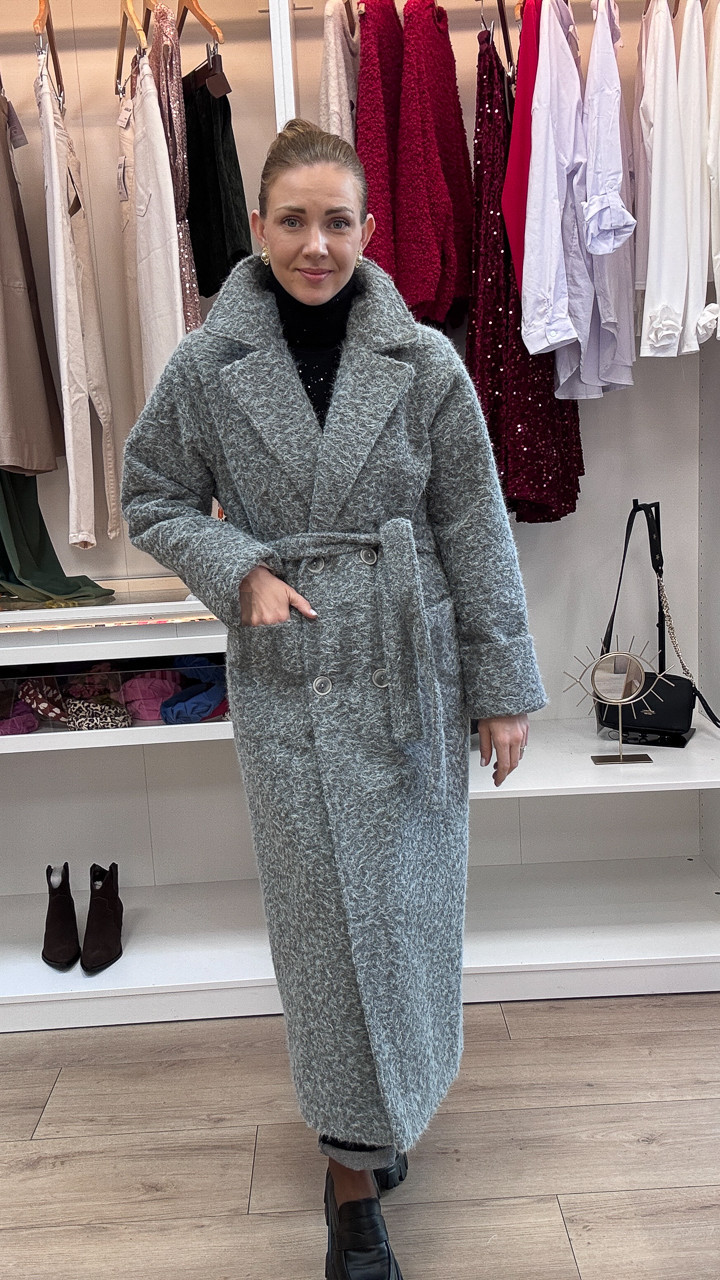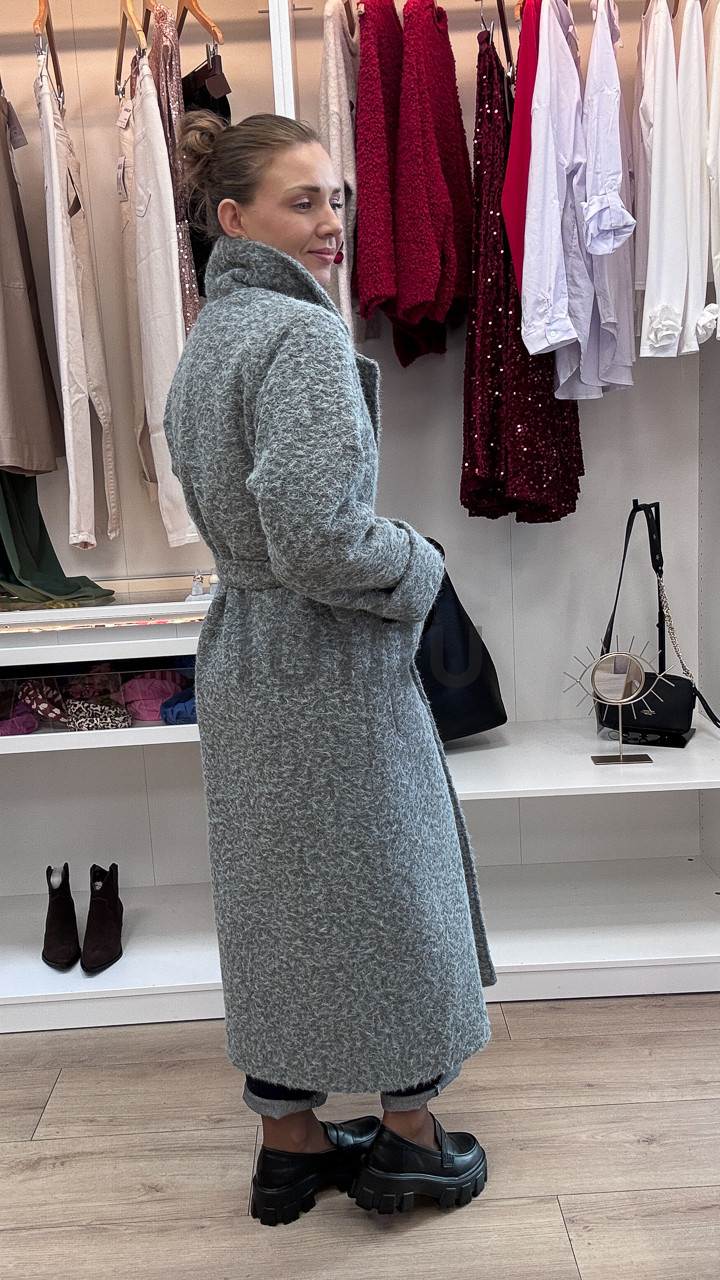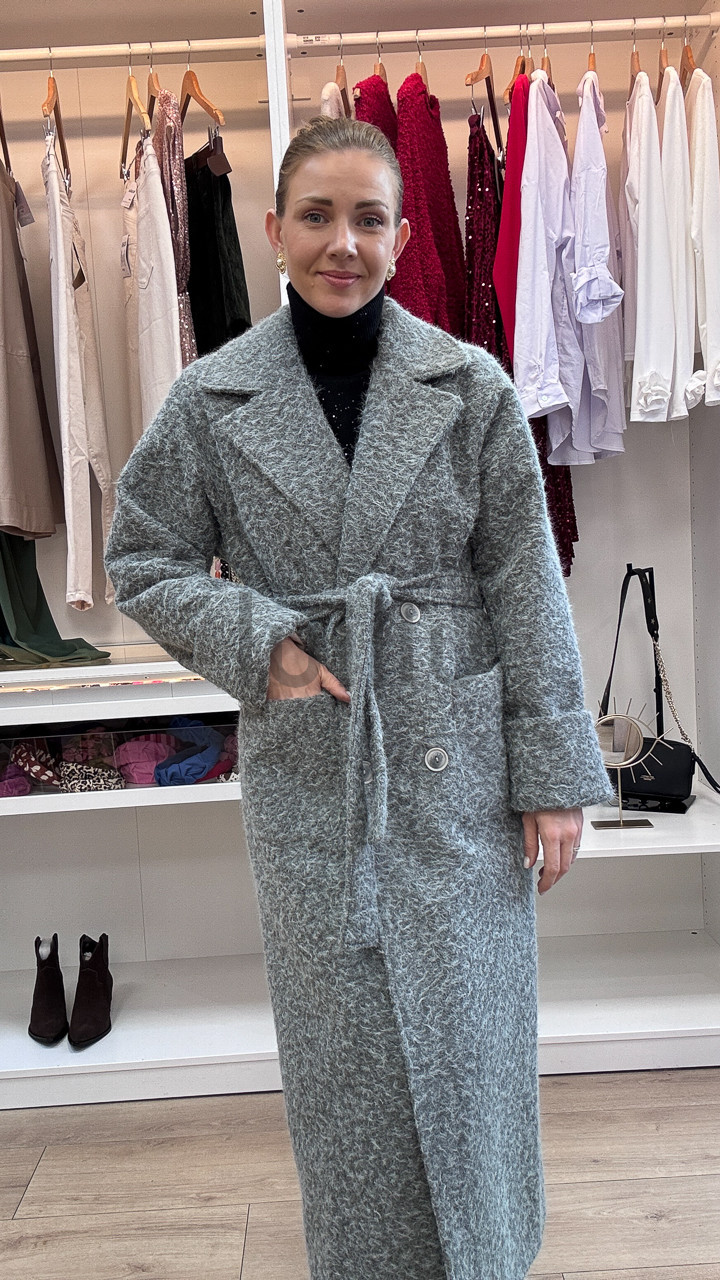 Elegancja i naturalne ciepło – szary, długi płaszcz damski z kolekcji jesiennej, wykonany w 80% z wełny, to kwintesencja stylu i komfortu na chłodniejsze dni. Naturalna wełna zapewnia doskonałe właściwości termiczne, gwarantując ciepło nawet w chłodne, wietrzne dni.