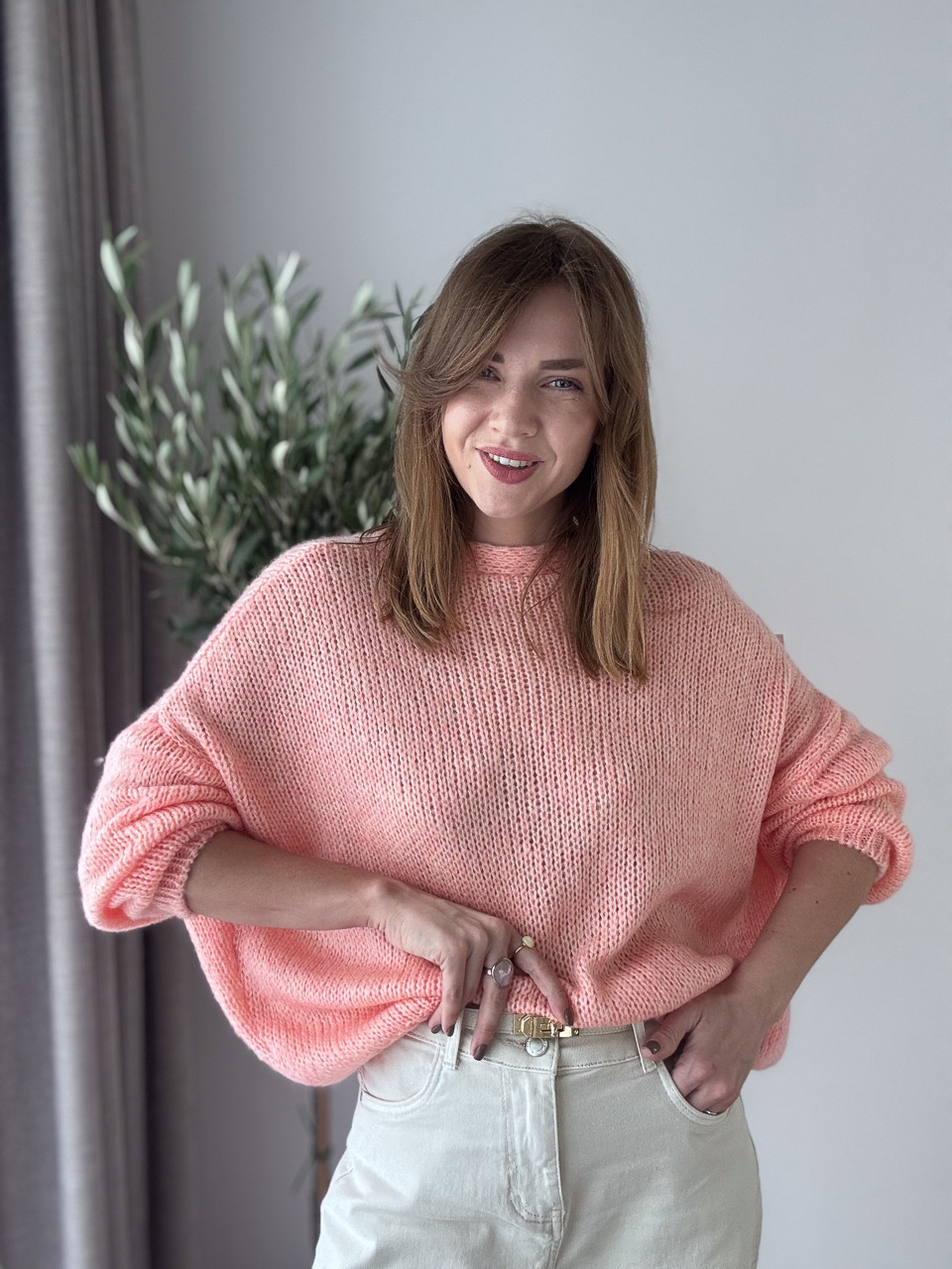 Ten sweter ma luźny, oversizowy fason, co oznacza, że jest nieco większy niż standardowe swetry.