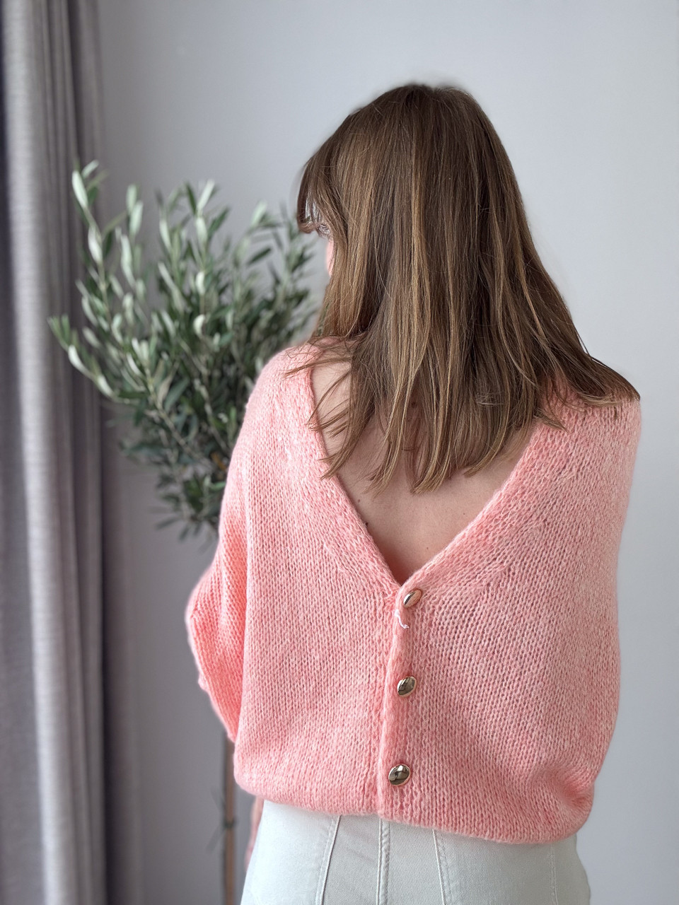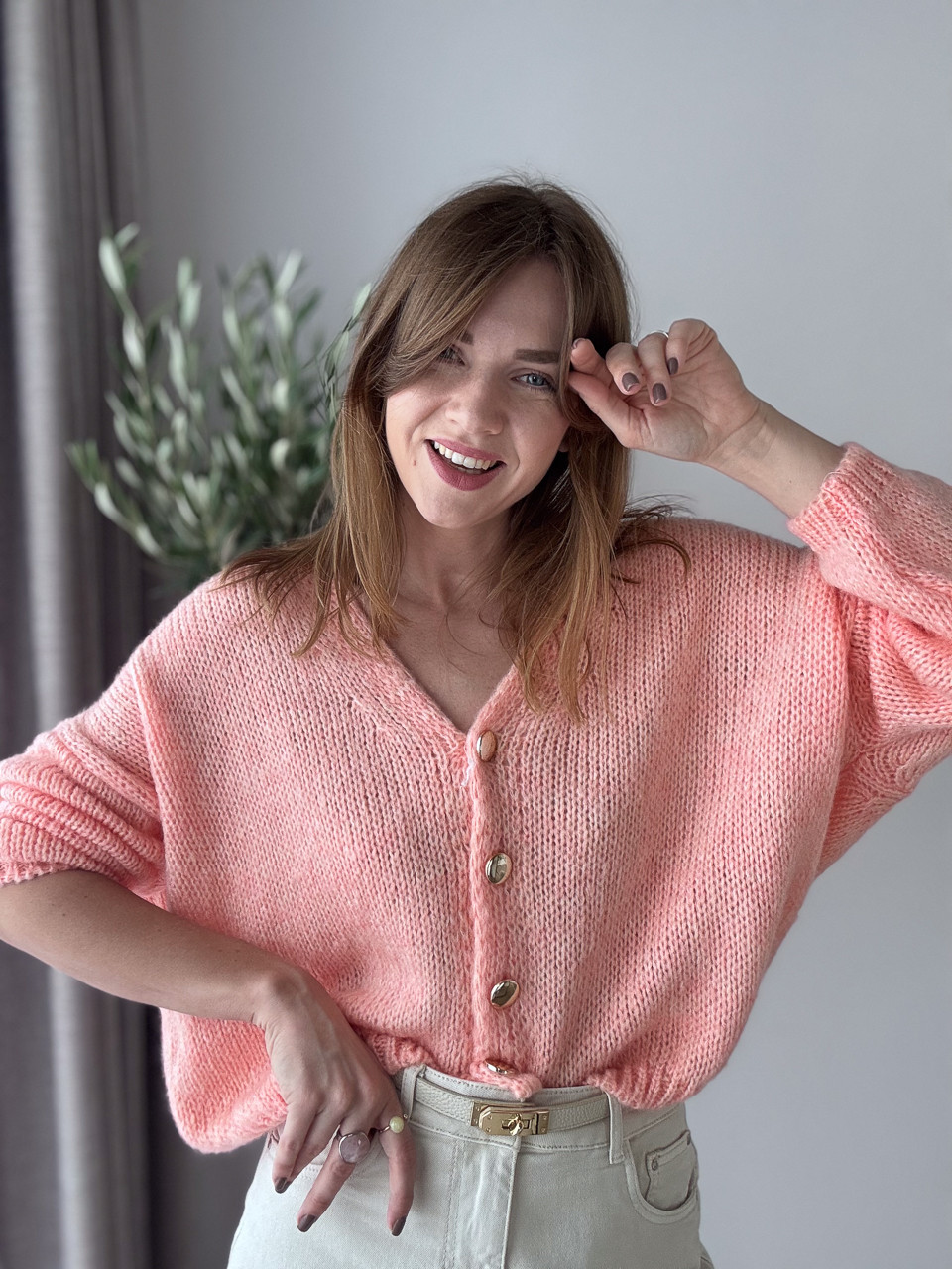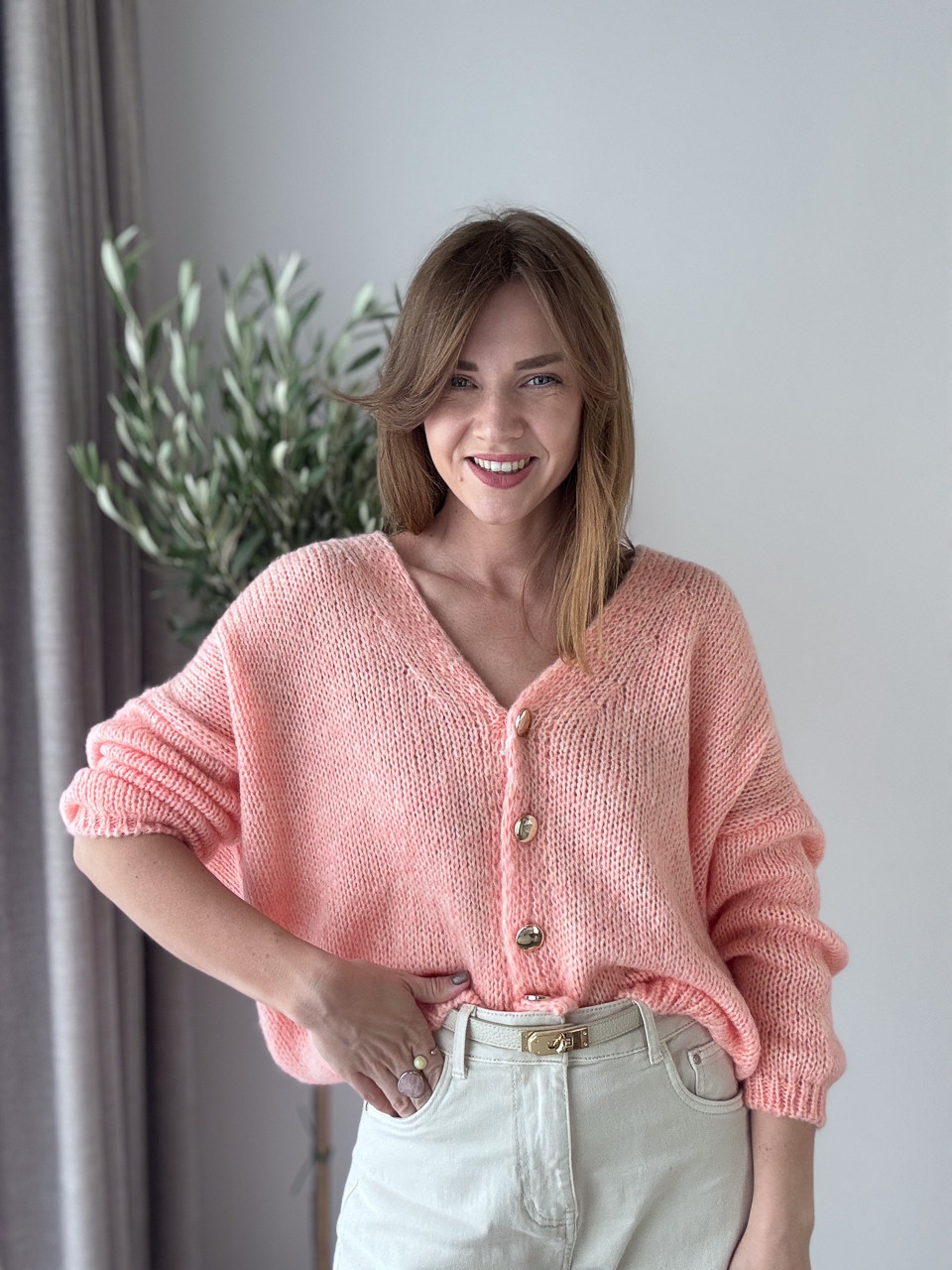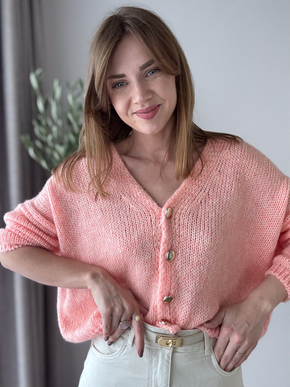 SWETER ROZPINANY MORELOWY PUDEŁKOWY FASON Z OZDOBNYM GUZIKIEM LUKRECJA