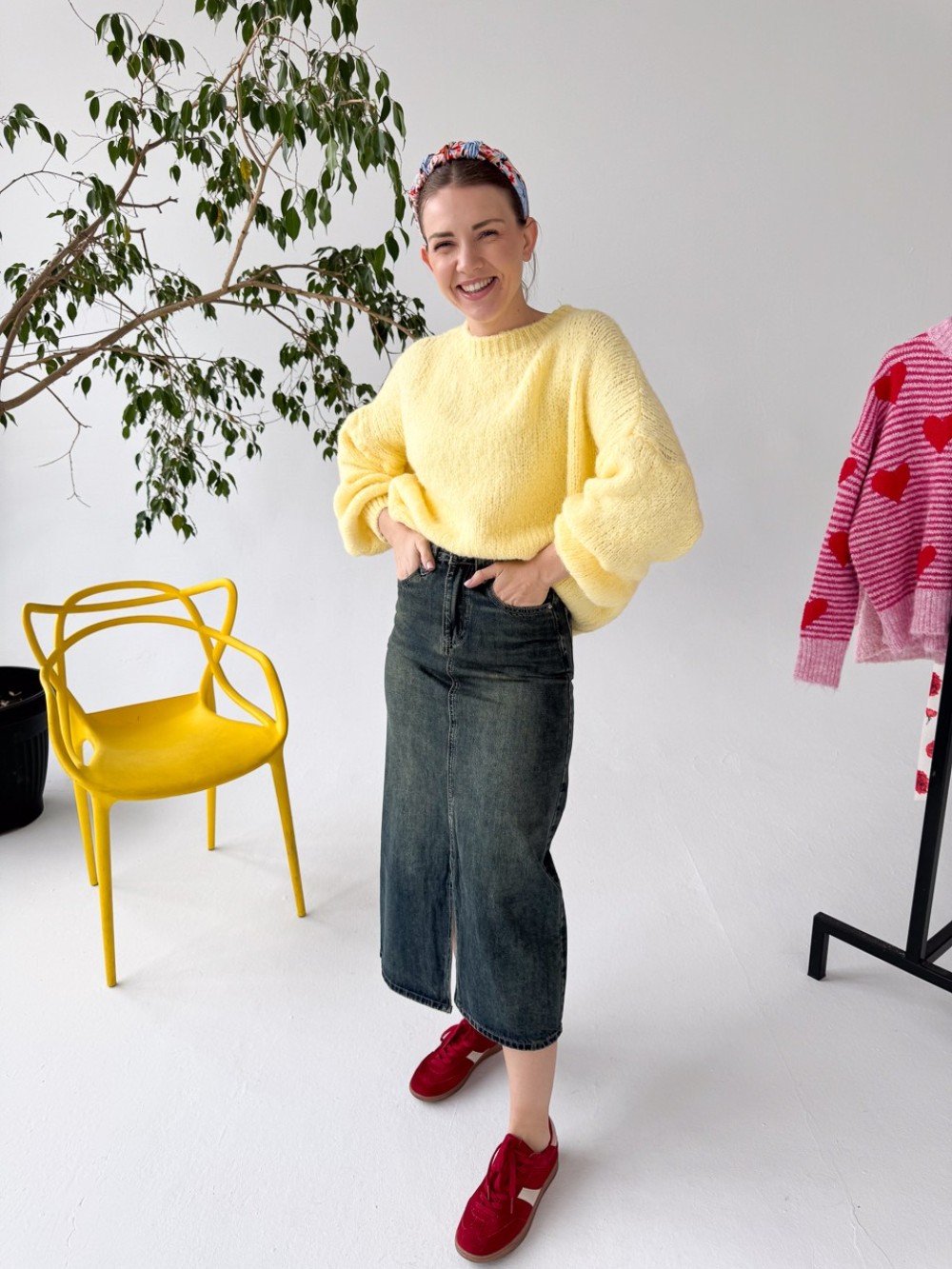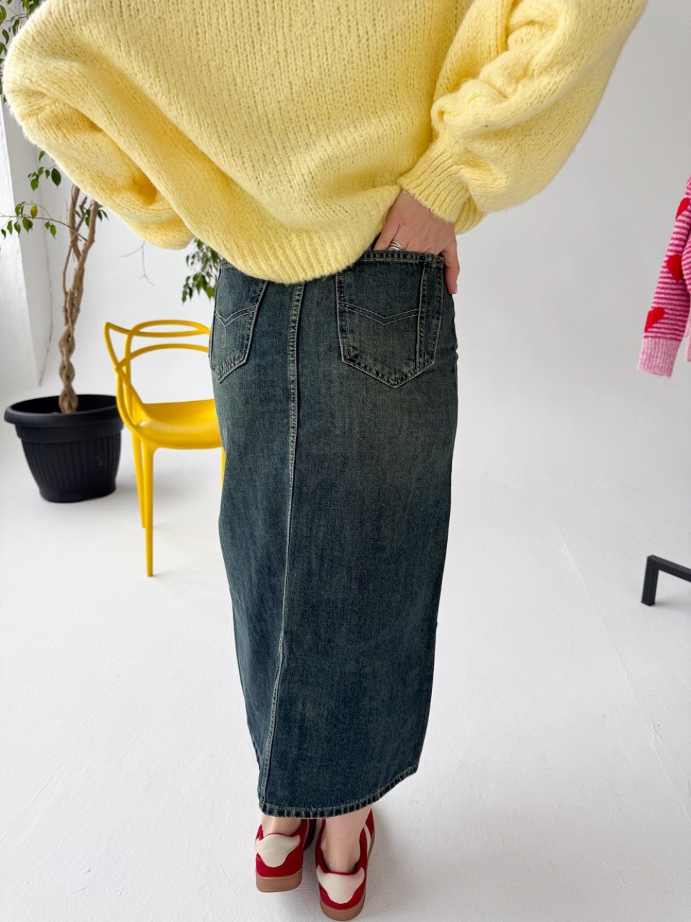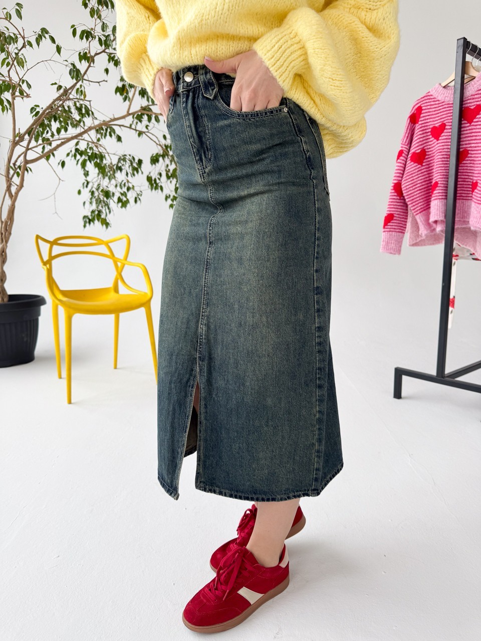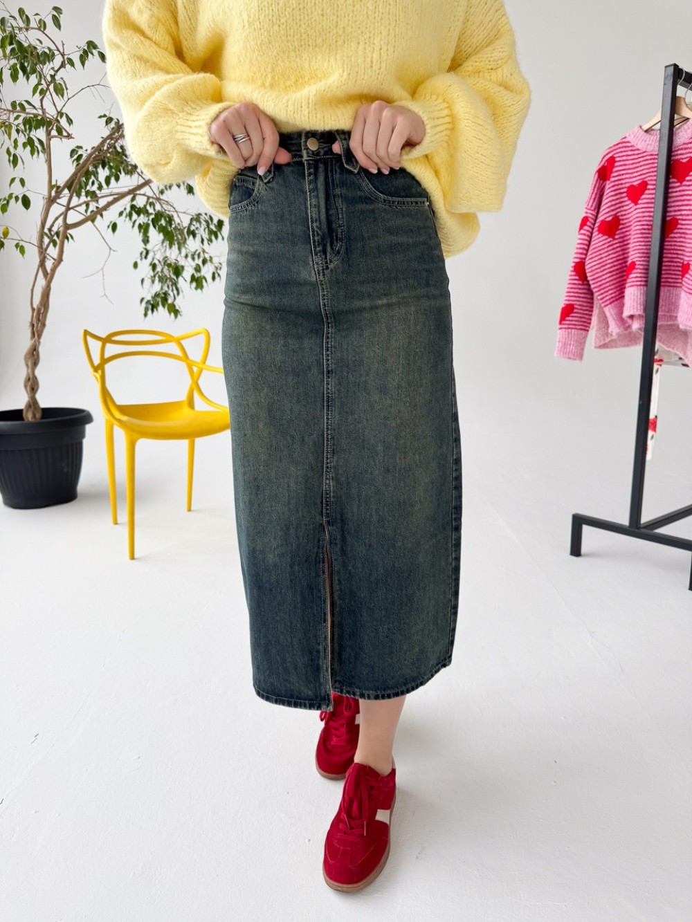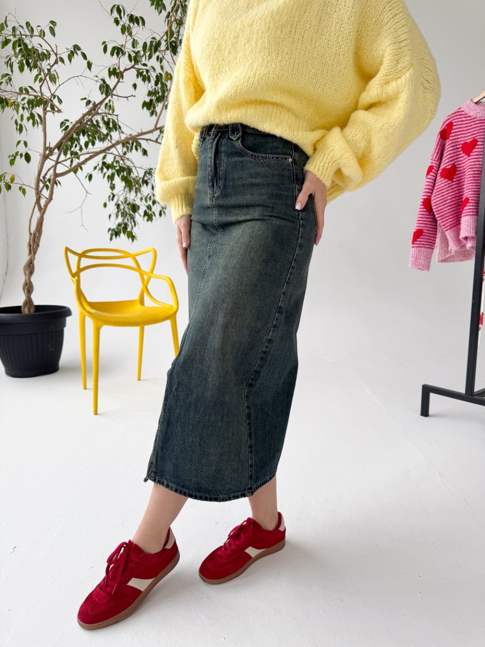 Unikalny zielony odcień – jeansowa spódnica w stylu vintage przyciąga uwagę nietuzinkowym kolorem, który podkreśla indywidualny charakter.