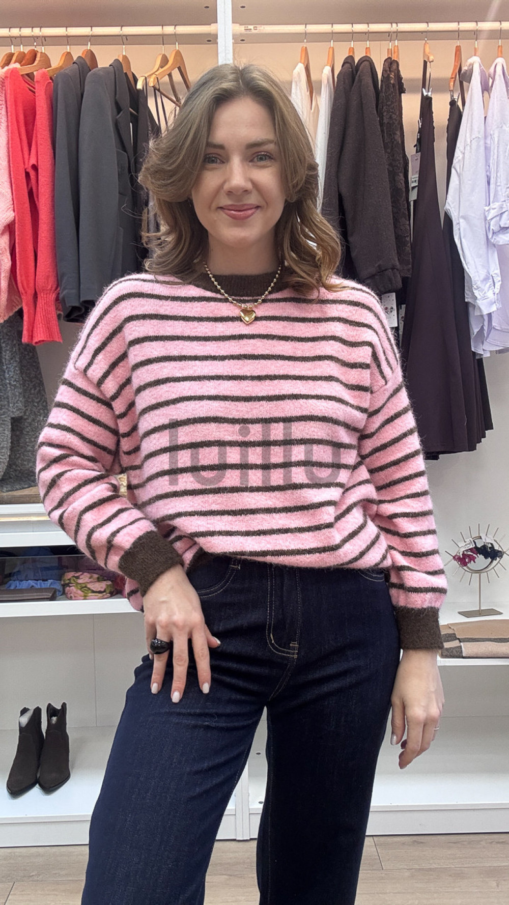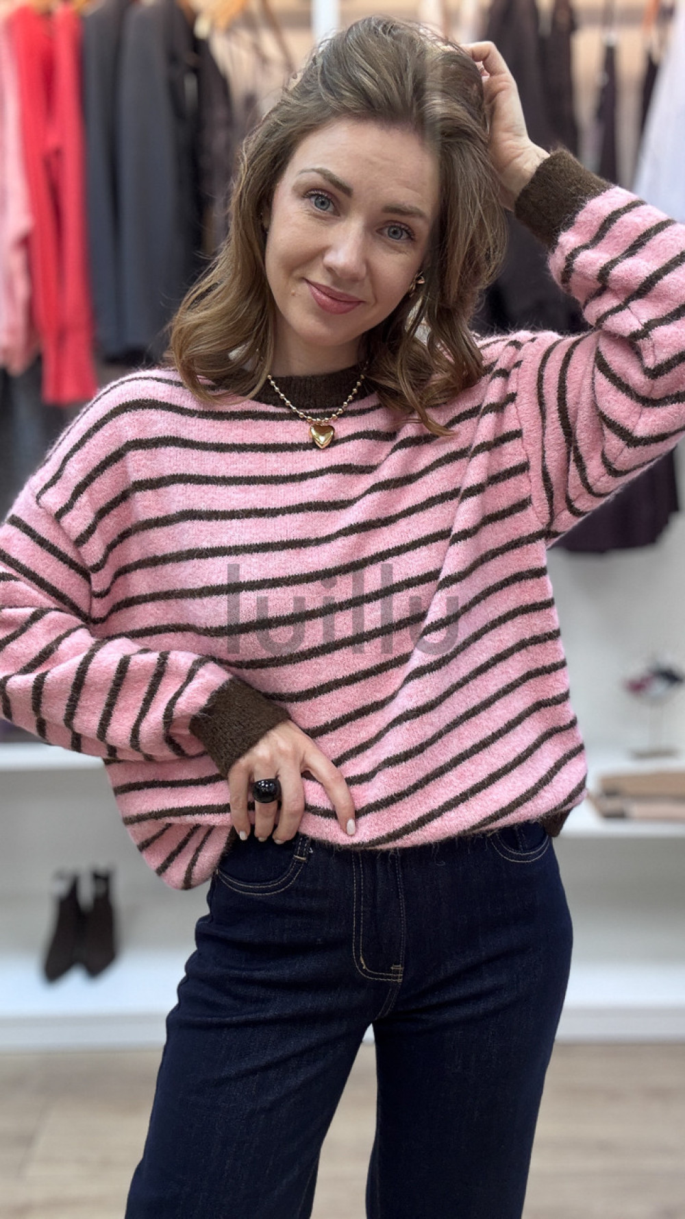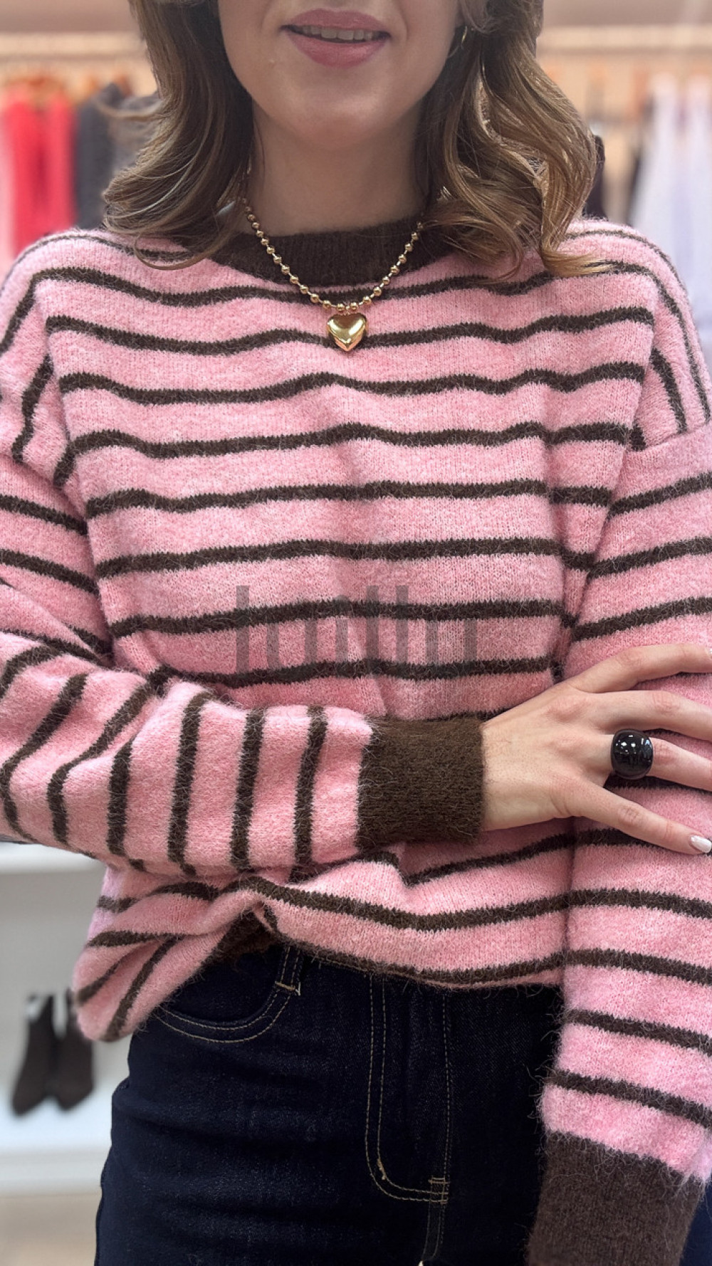 SWETER PUDROWY W CZEKOLADOWE PASKI