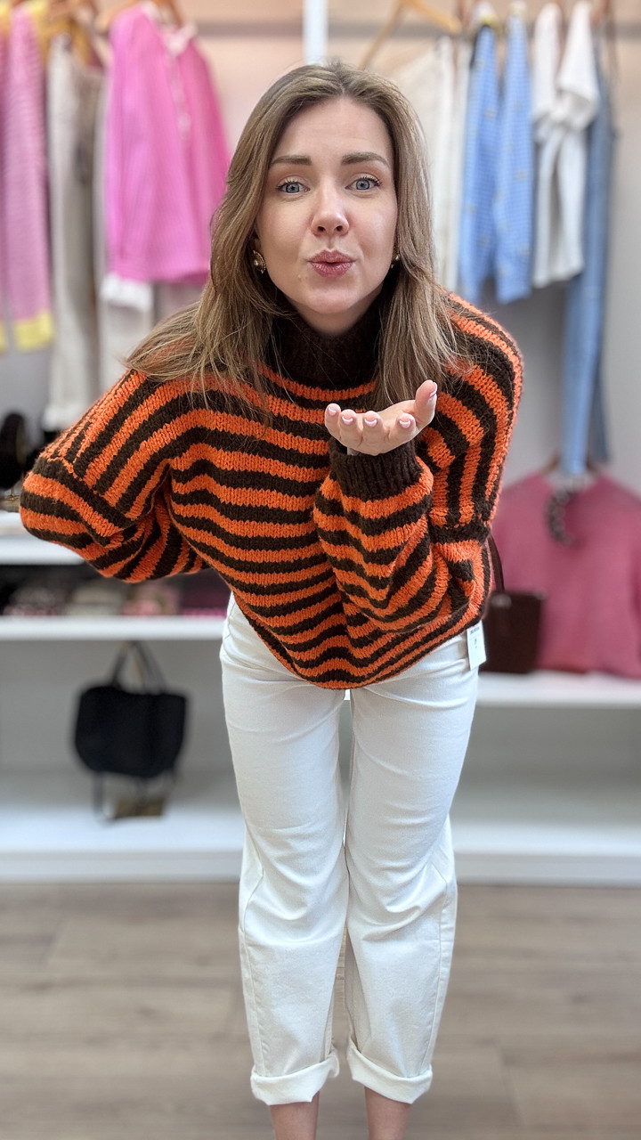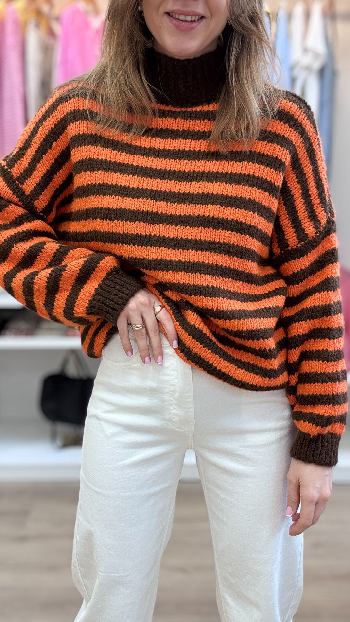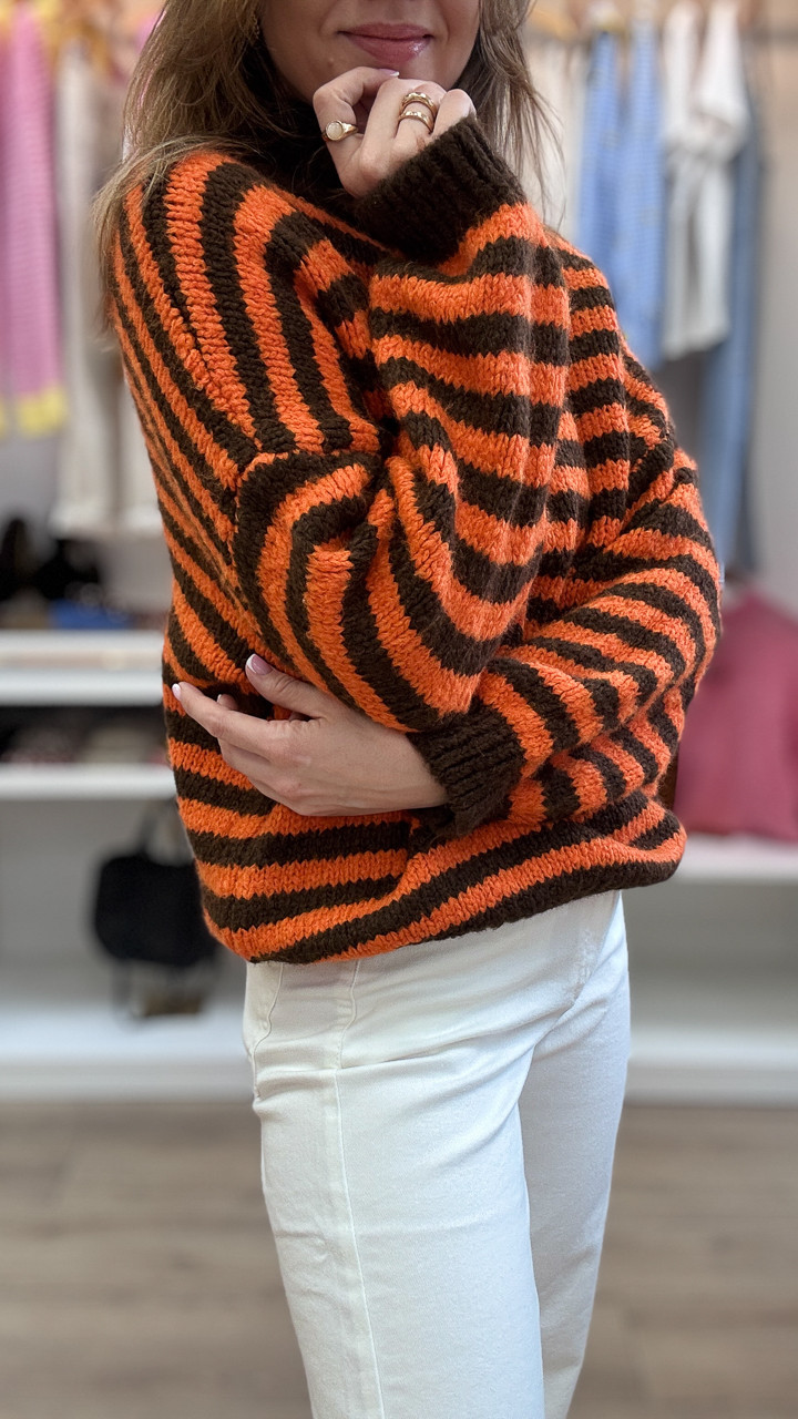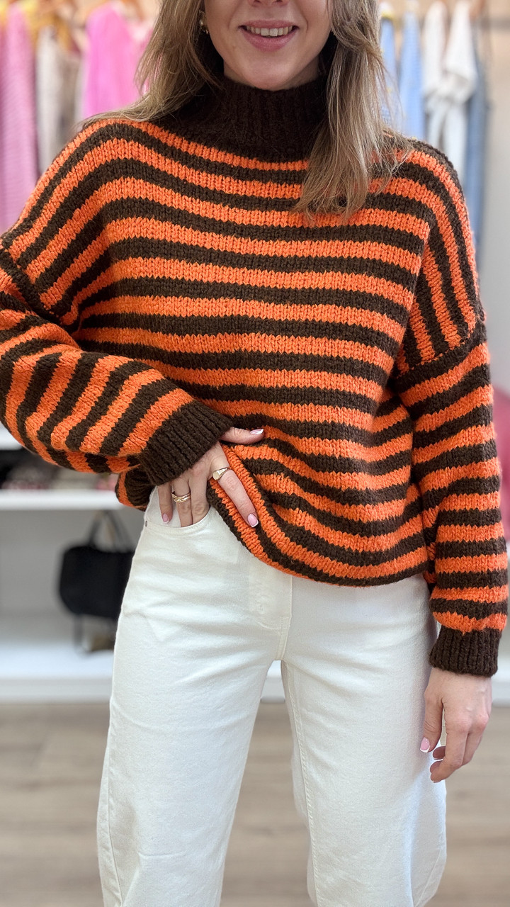 SWETER W CZEKOLADOWE PASKI I POMARAŃCZOWE