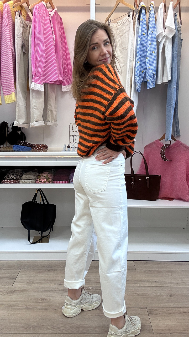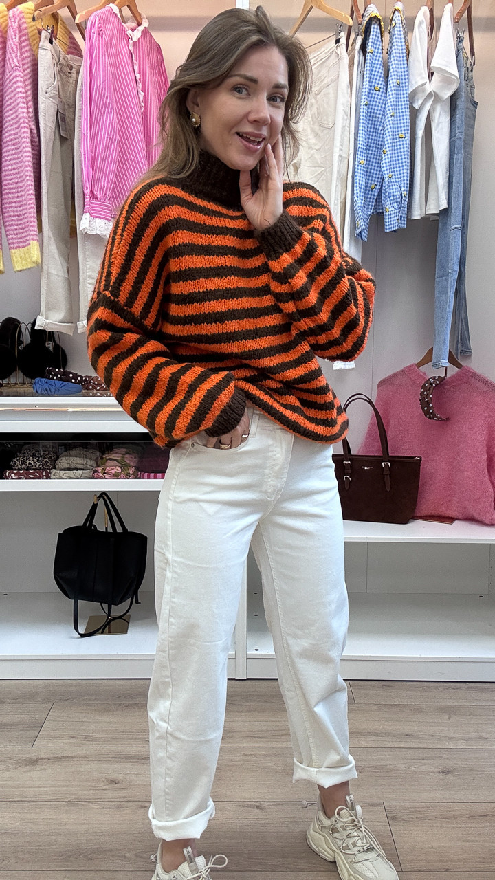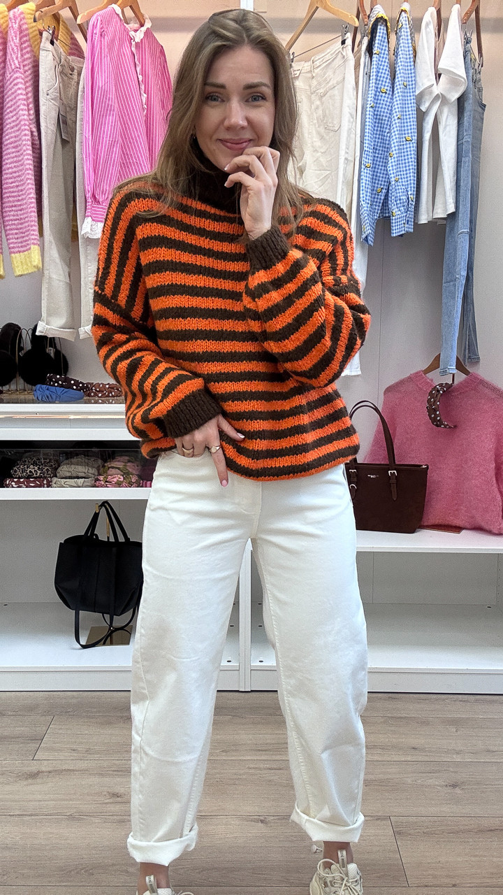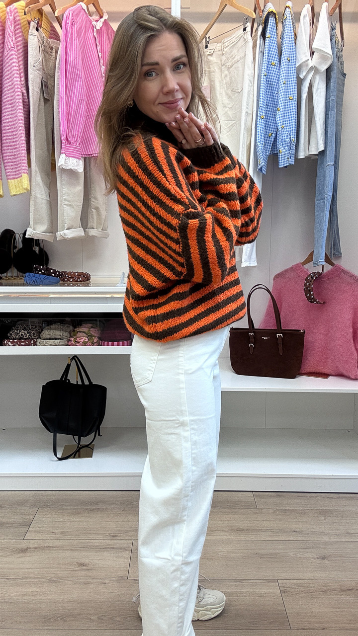 SWETER W CZEKOLADOWE PASKI I POMARAŃCZOWE