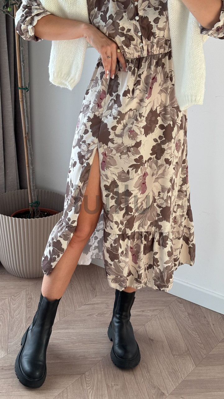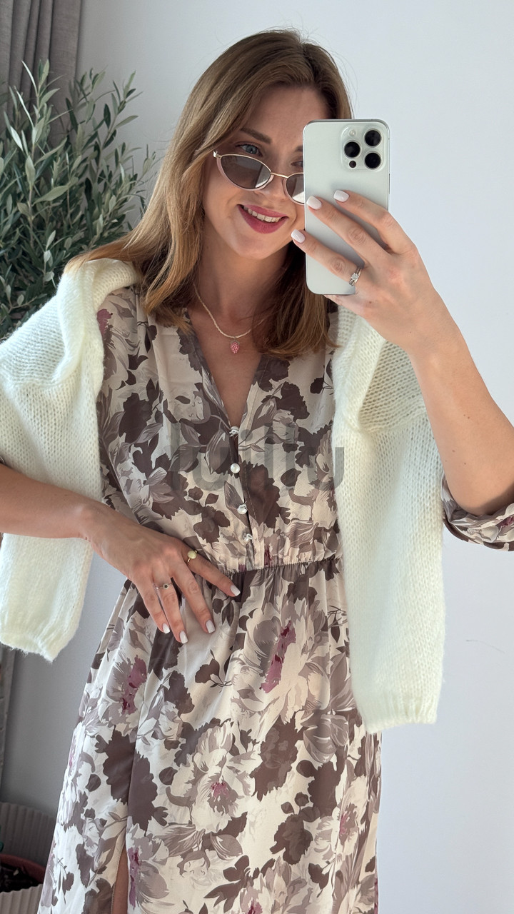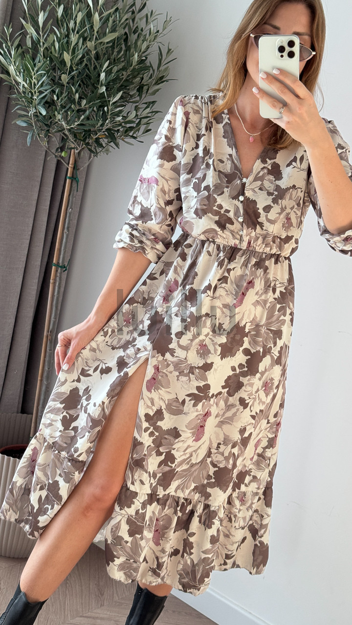 Prześliczna sukienka uniwersalna z dekoltem w serek, zapinana na guziczki. Ta elegancka kreacja posiada gumkę w talii, która pięknie podkreśla sylwetkę, oraz atrakcyjną falbankę z rozcięciem na dole, dodającą lekkości i kobiecego uroku. Idealna na różne okazje, zapewni wygodę i stylowy wygląd każdej kobiecie. Dobry wybór dla nowych matek, umożliwiający dyskretne karmienie piersią.
