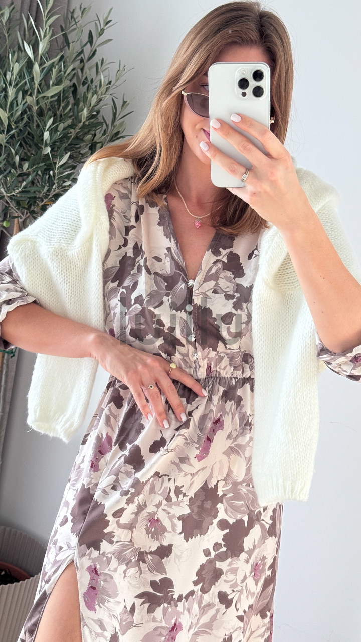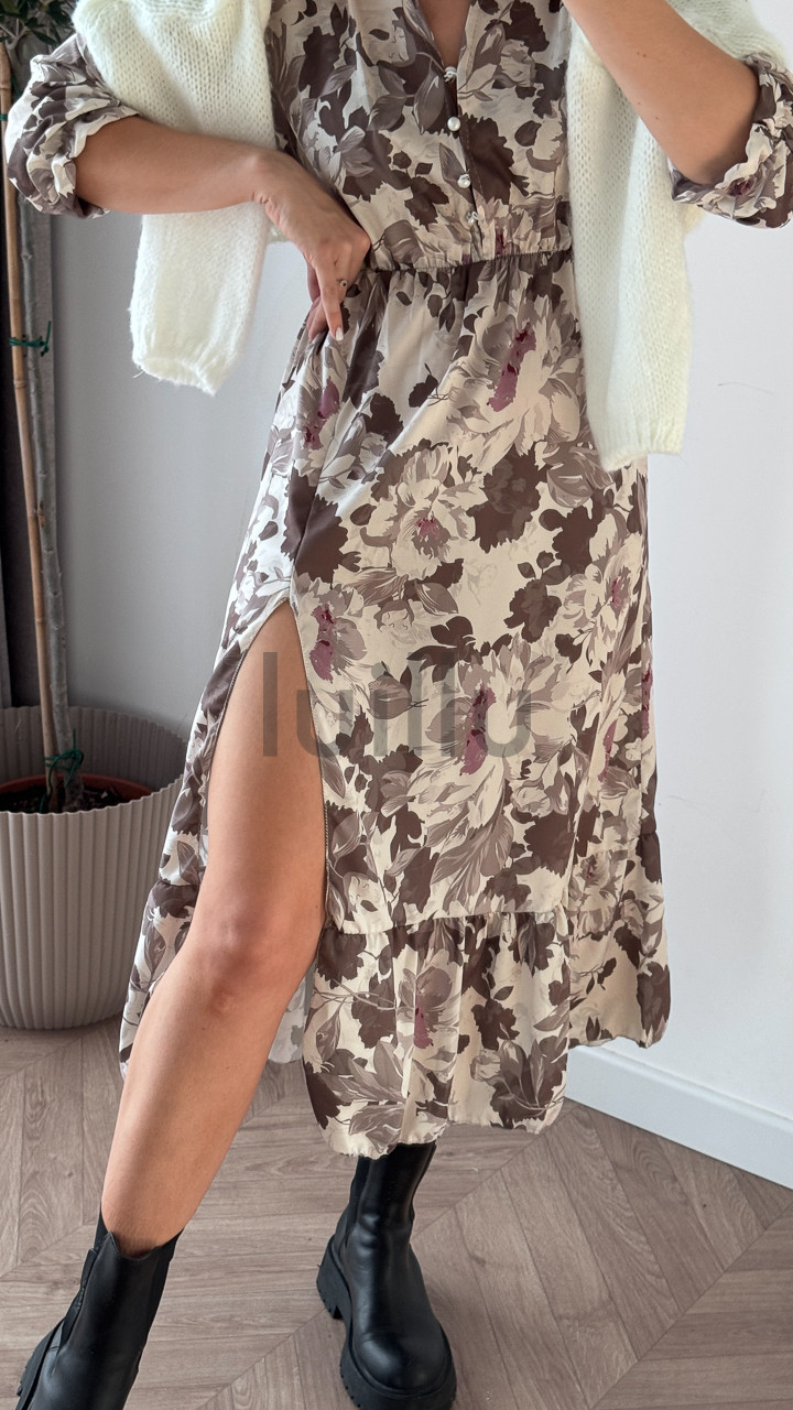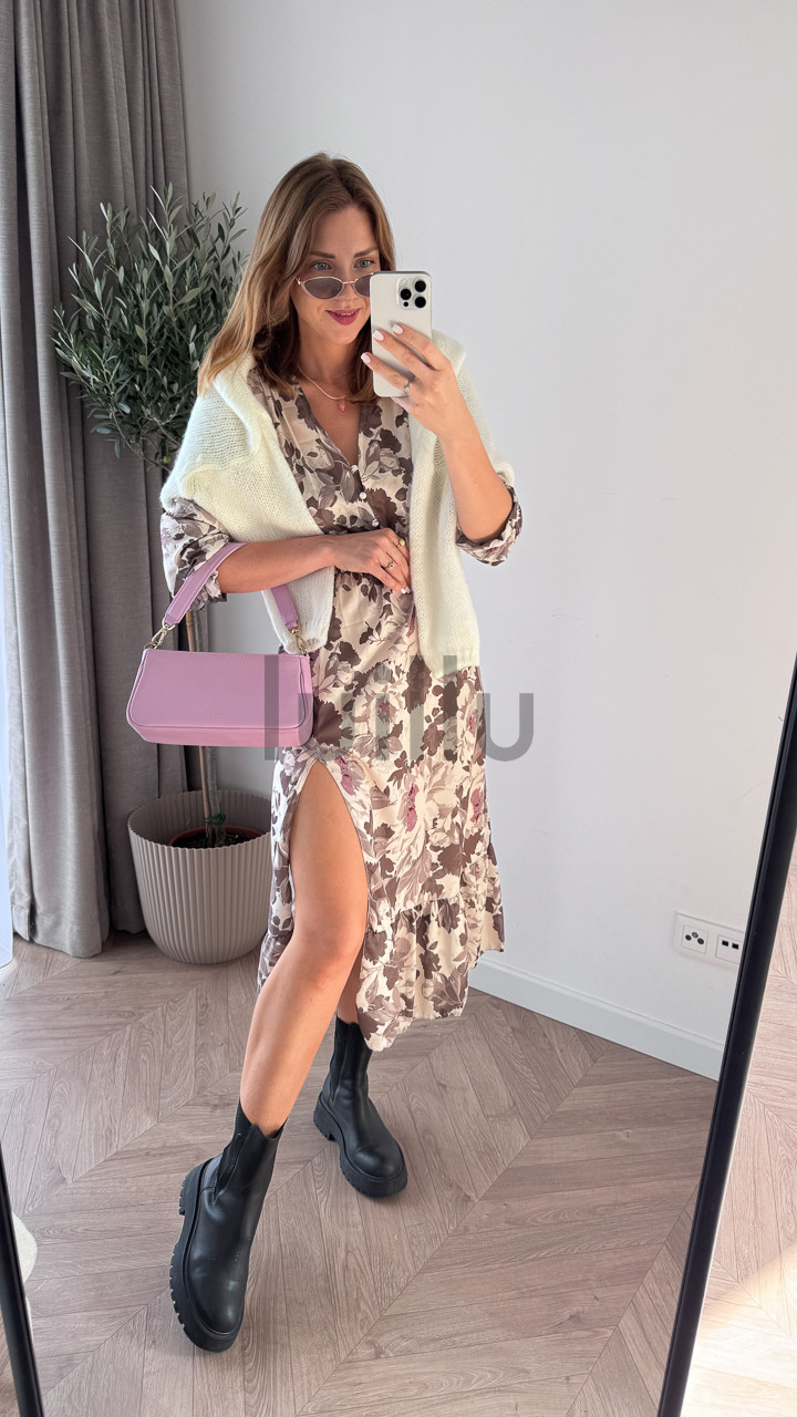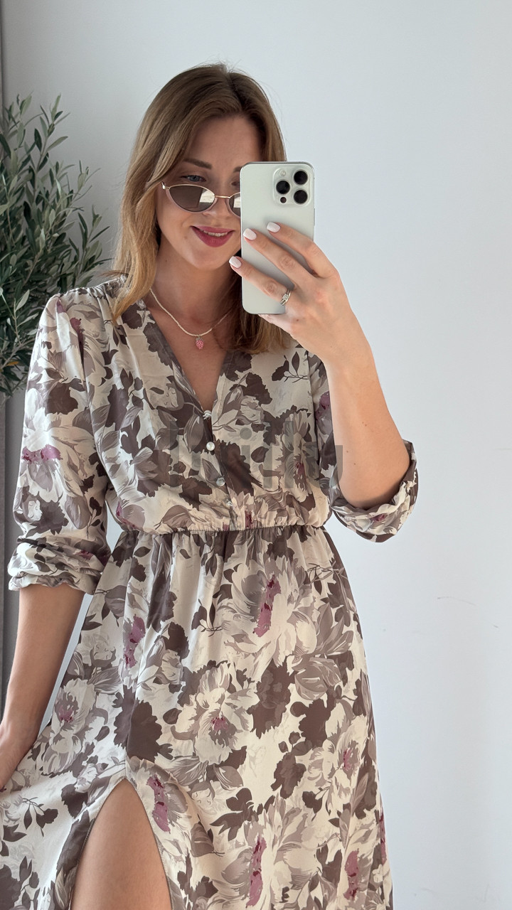 Prześliczna sukienka uniwersalna z dekoltem w serek, zapinana na guziczki. Ta elegancka kreacja posiada gumkę w talii, która pięknie podkreśla sylwetkę, oraz atrakcyjną falbankę z rozcięciem na dole, dodającą lekkości i kobiecego uroku. Idealna na różne okazje, zapewni wygodę i stylowy wygląd każdej kobiecie. Dobry wybór dla nowych matek, umożliwiający dyskretne karmienie piersią.