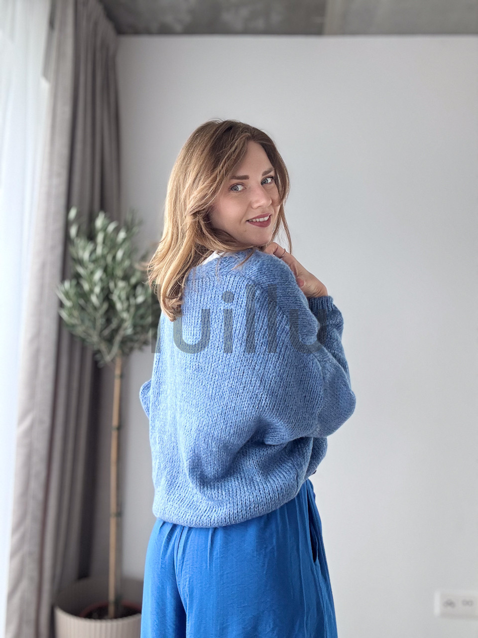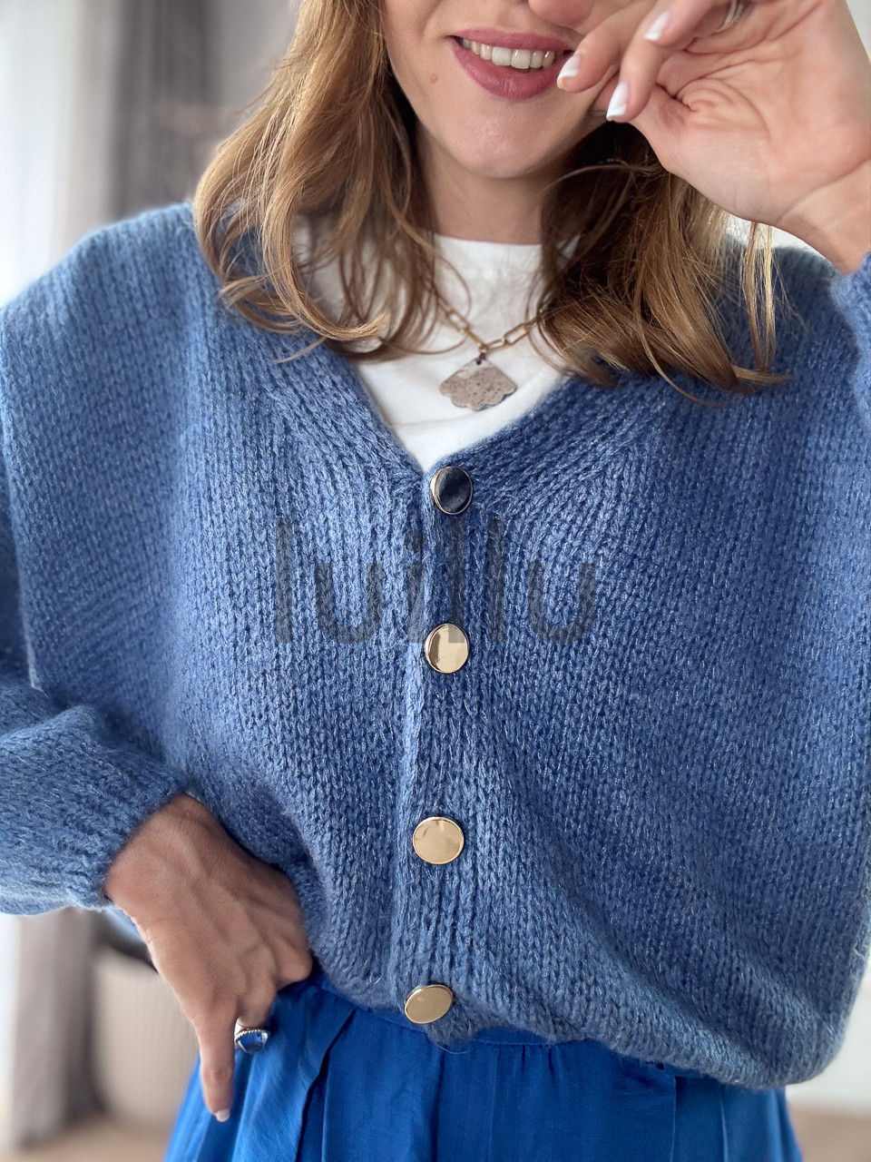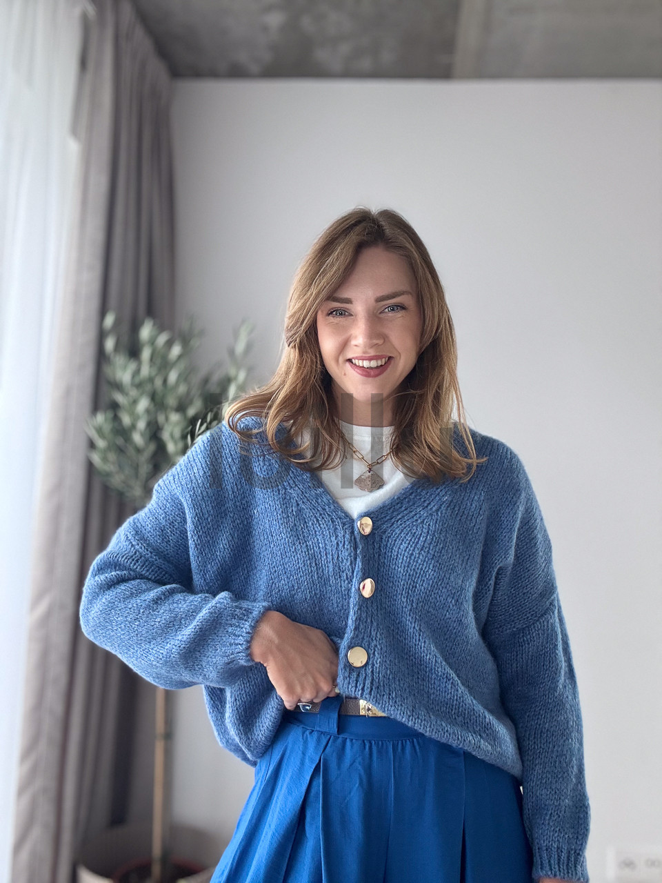 SWETER ROZPINANY DŻINS PUDEŁKOWY FASON Z OZDOBNYM GUZIKIEM LUKRECJA