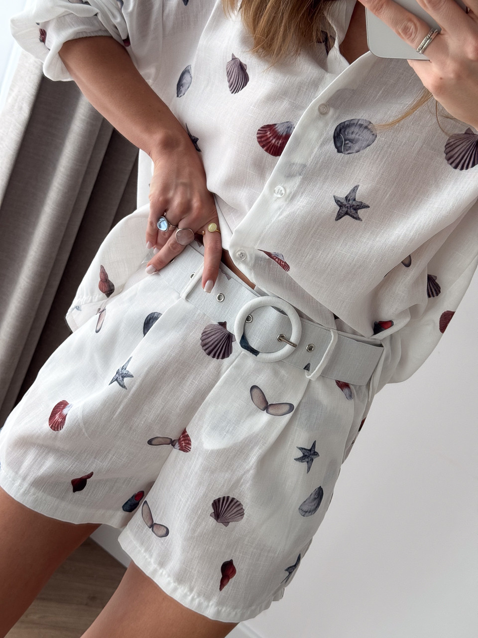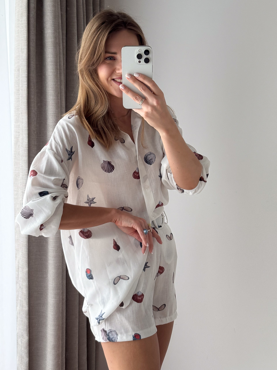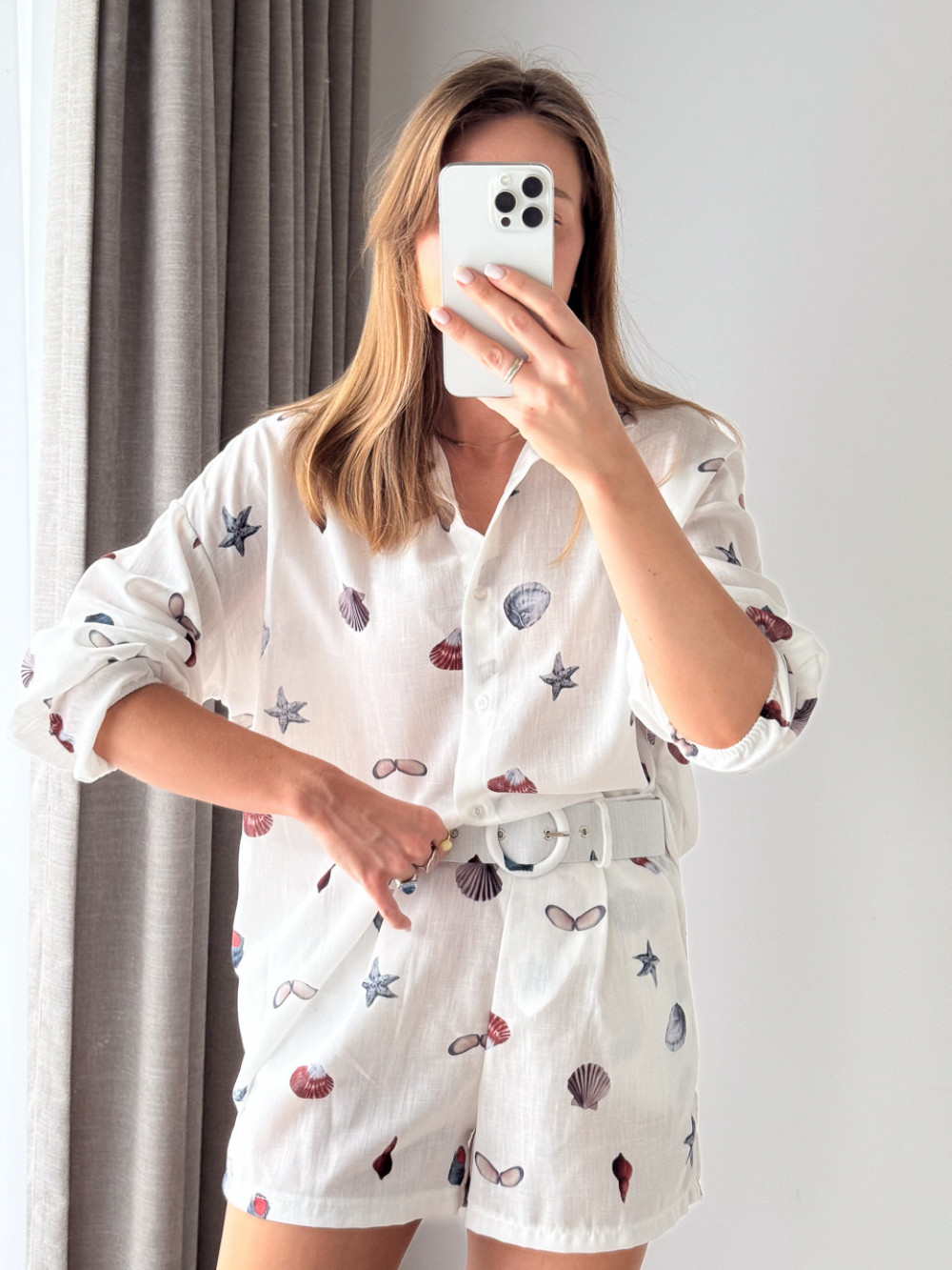 Słowa kluczowe: biały komplet w muszelki, letni komplet damski, koszula z szortami lato, wakacyjny komplet z printem, komplet plażowy damski