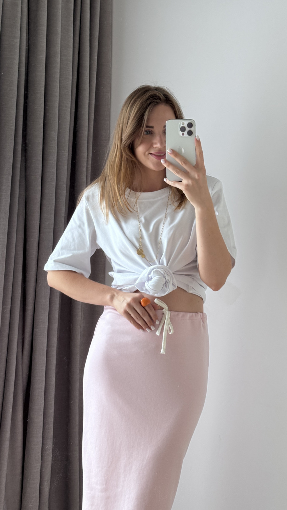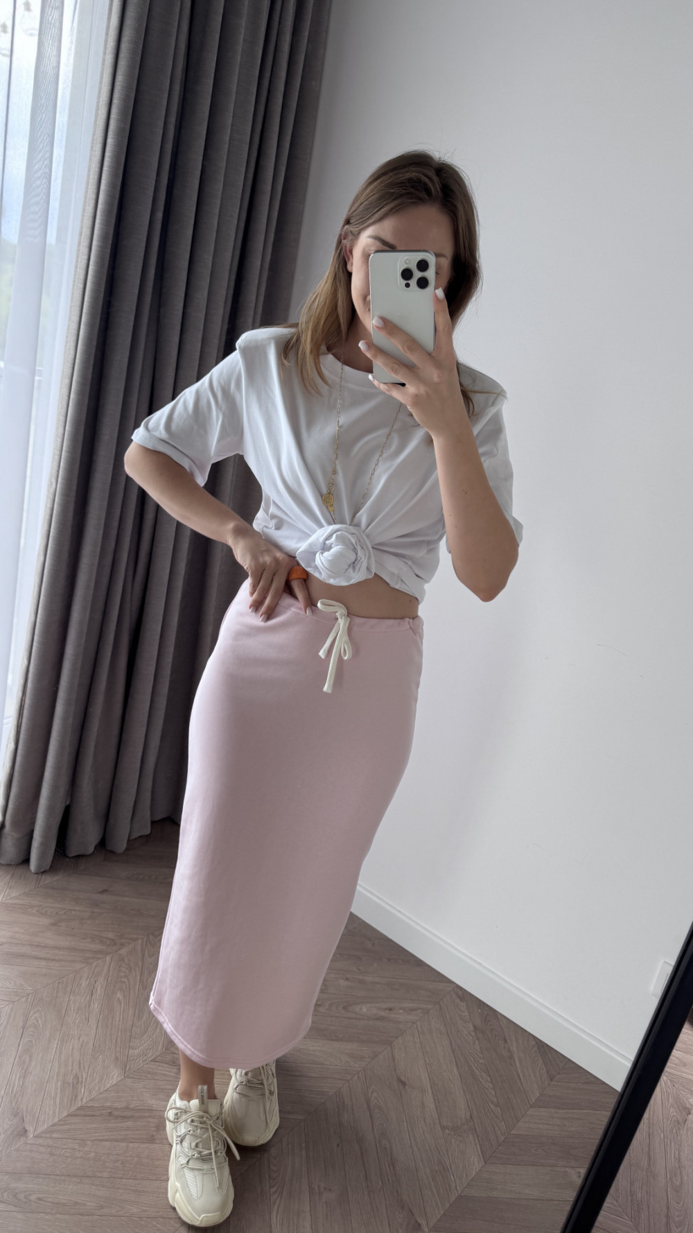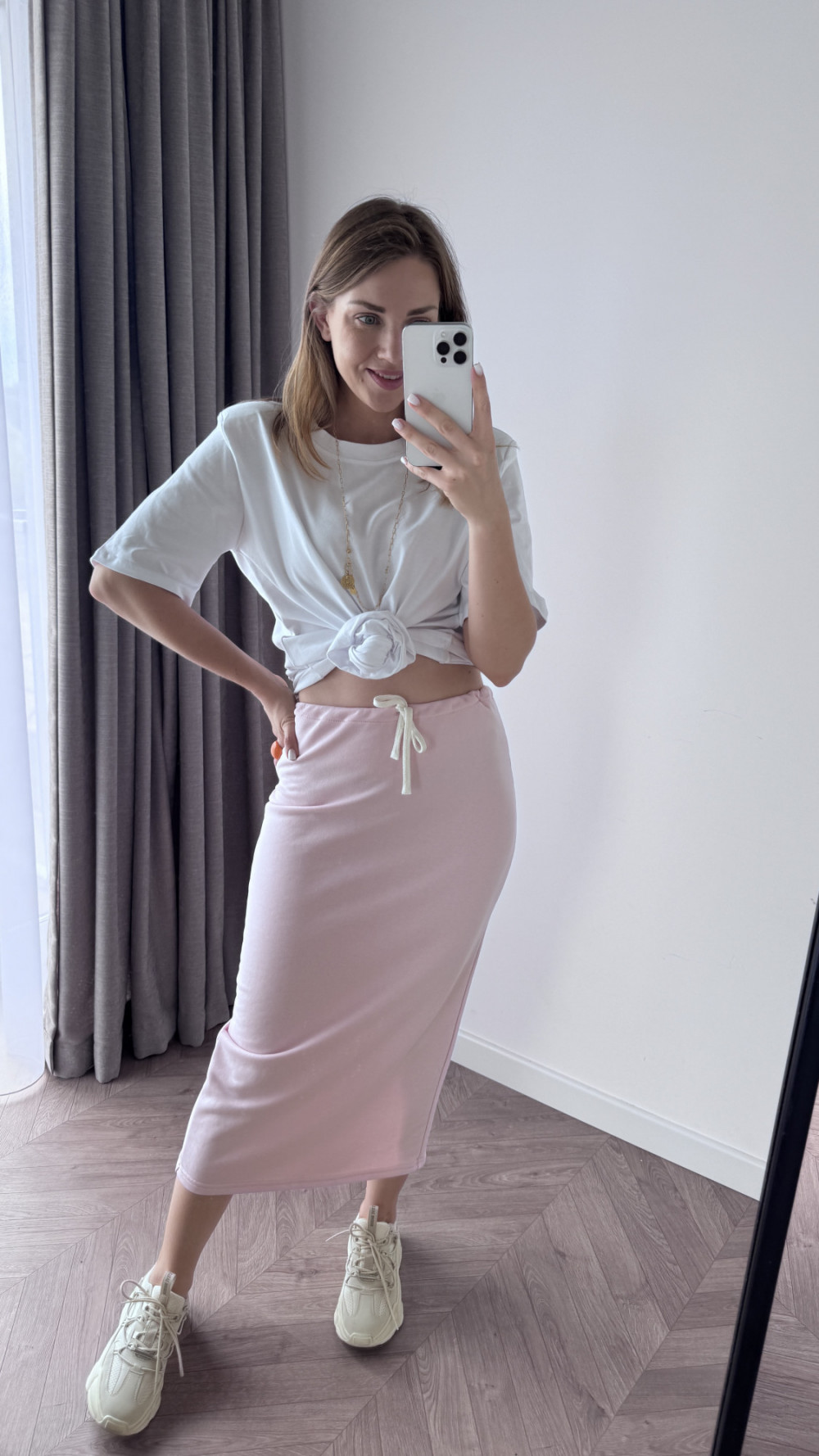 To różowa spódnica midi, która świetnie wygląda z t-shirtem, bluzą lub marynarką uniwersalna baza stylu comfort