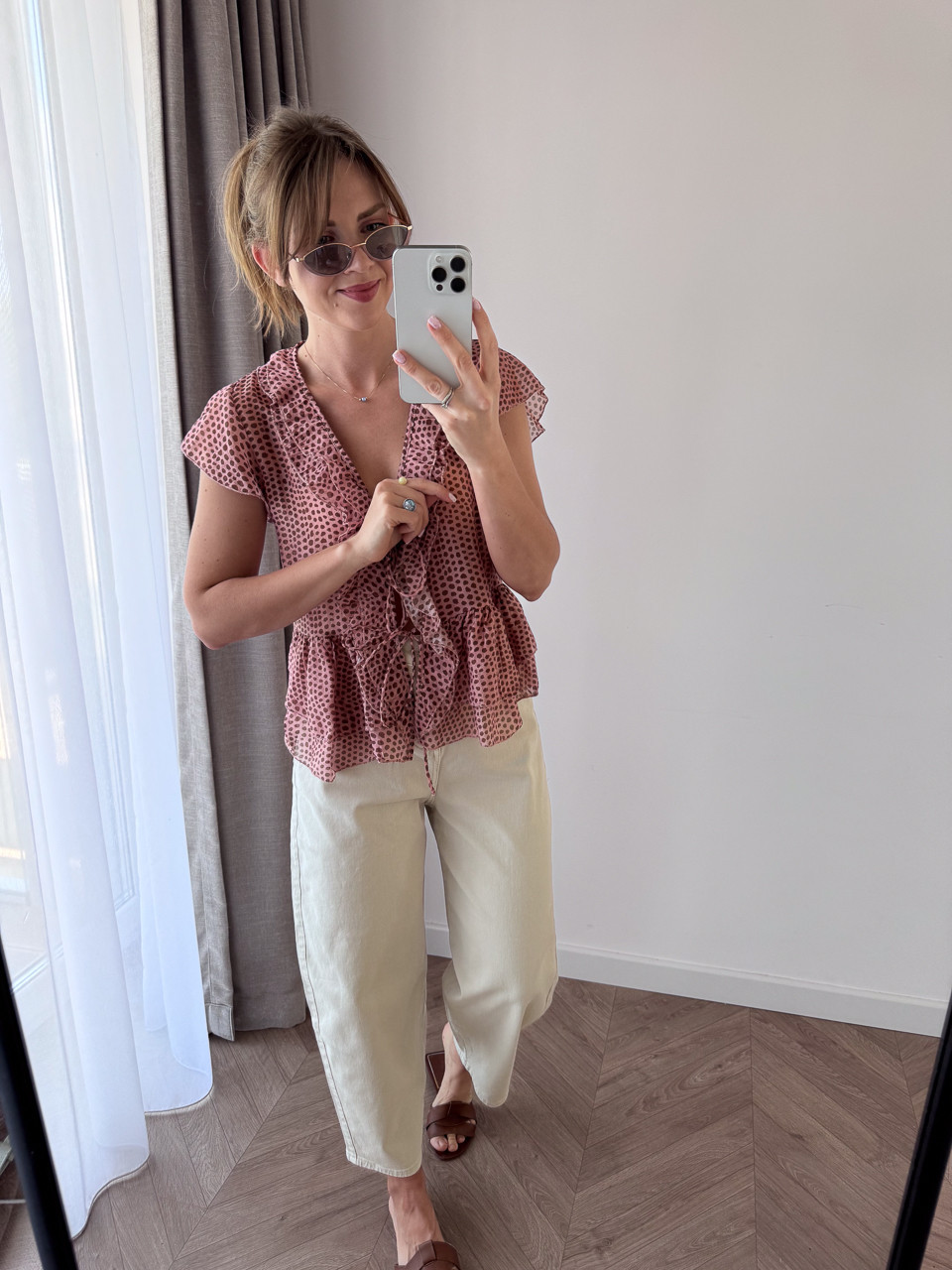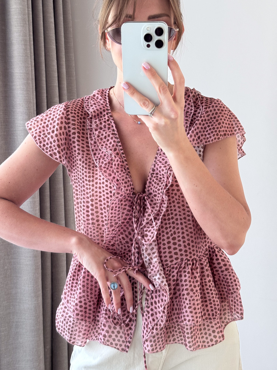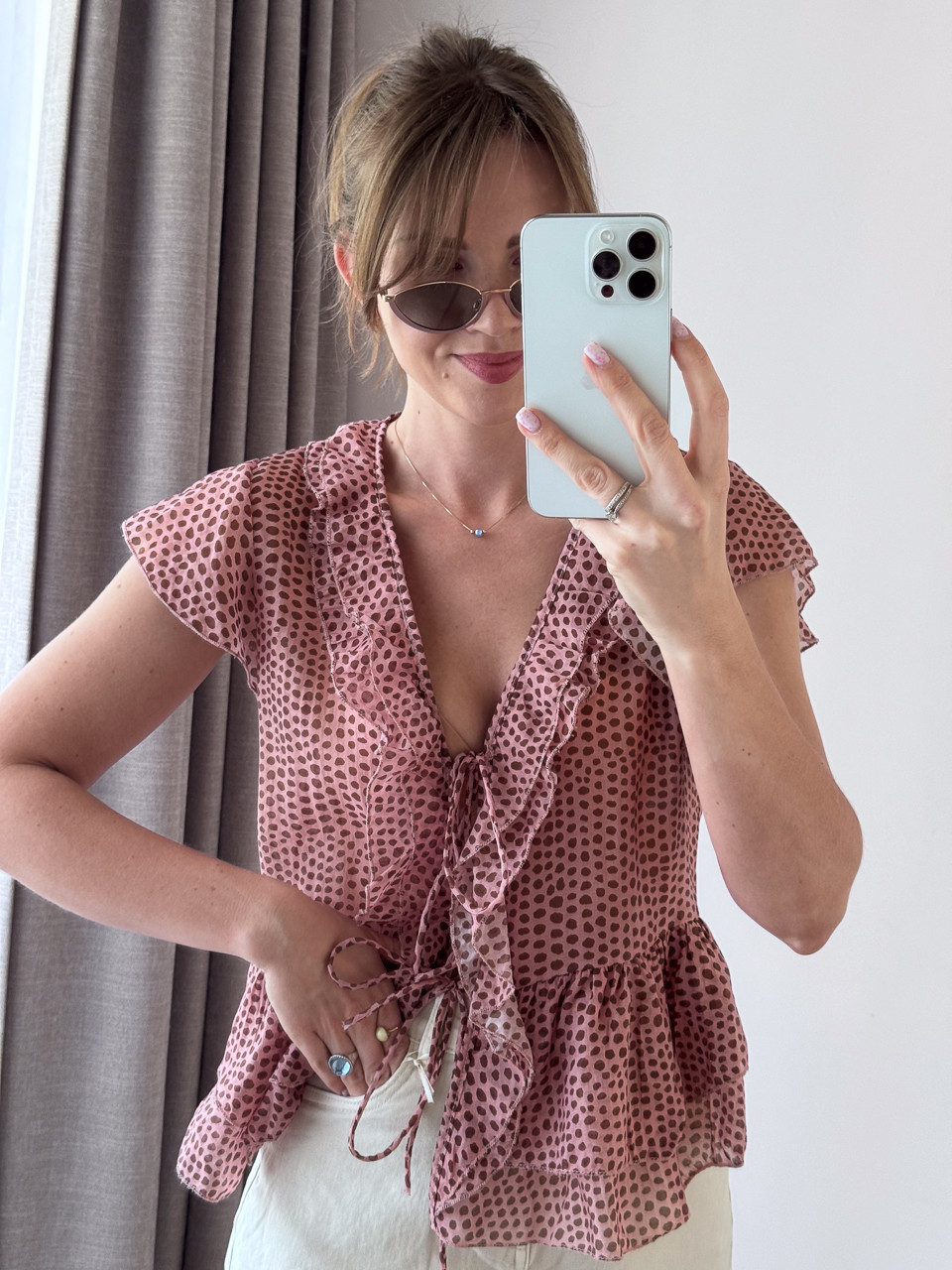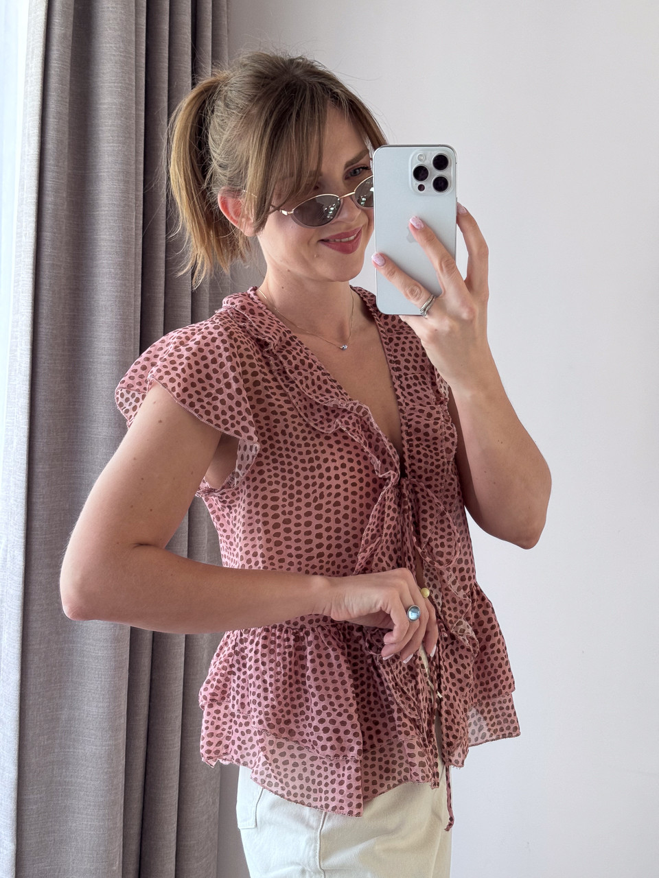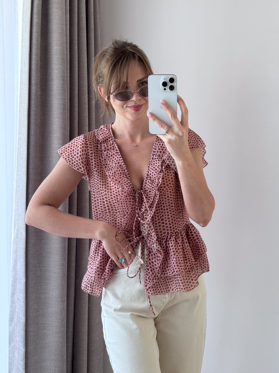 KOSZULA Z ROMANTYCZNYM WIĄZANIEM PUDROWA W GROSZKI