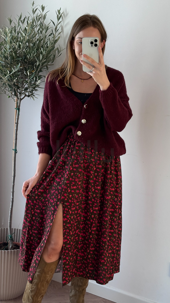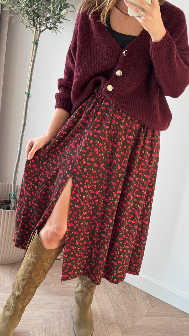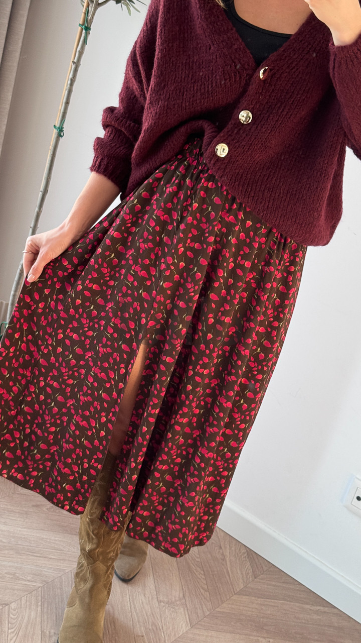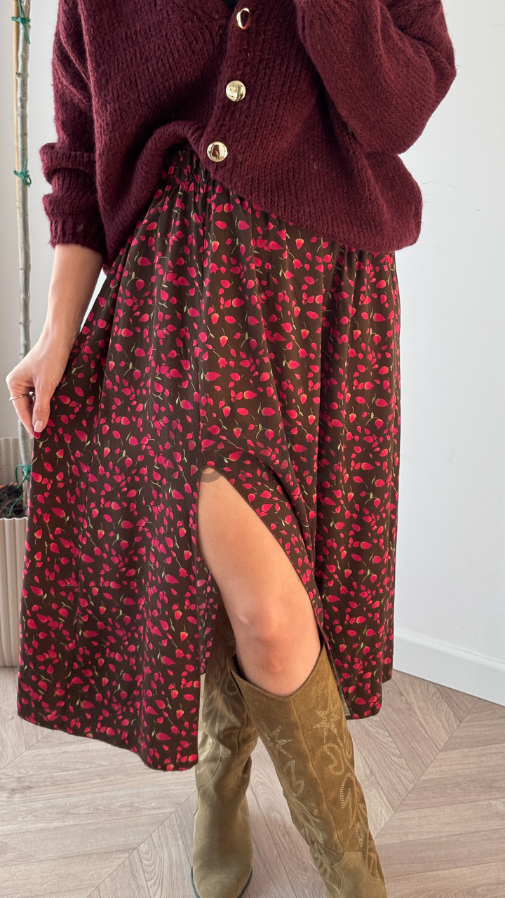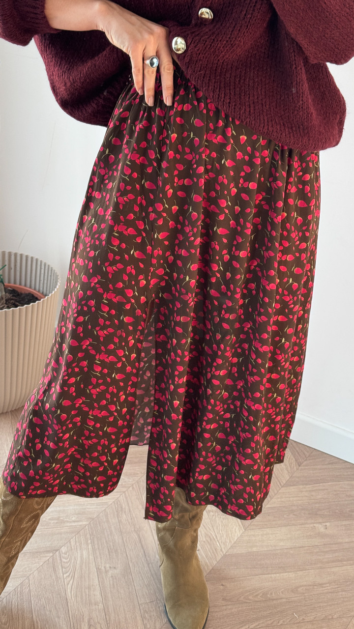 SPÓDNICA VALERIA CZEKOLADOWA W CZERWONE PĄCZKI RÓZ