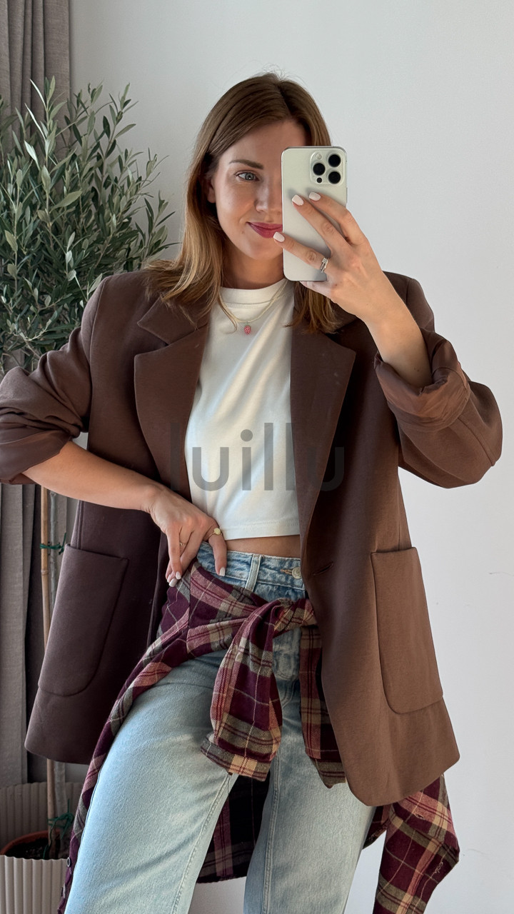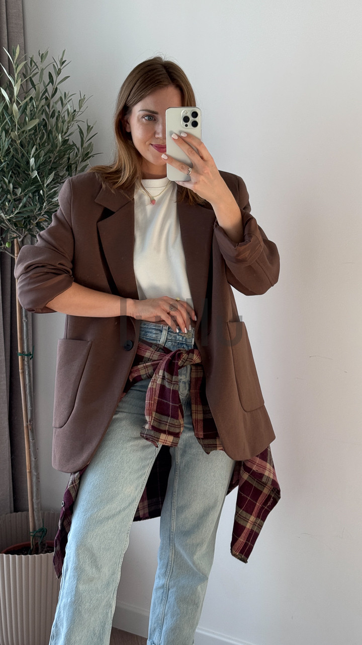 Bordowy kolor otula sylwetkę ciepłem, a krata nadaje całości casualowego charakteru.