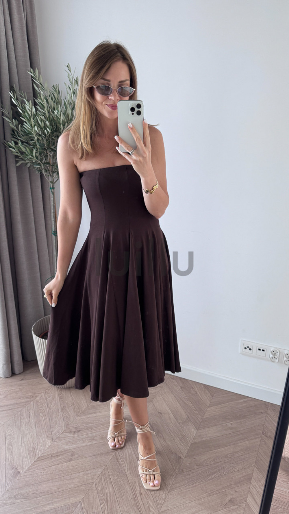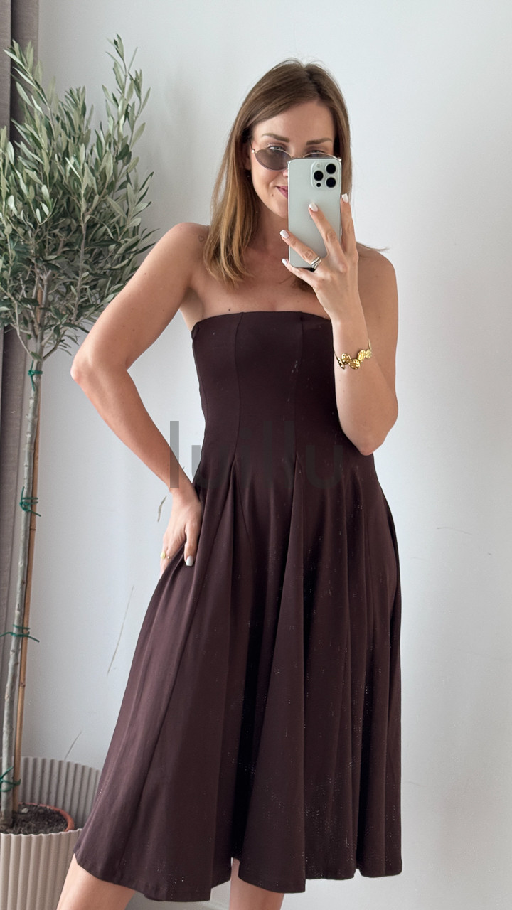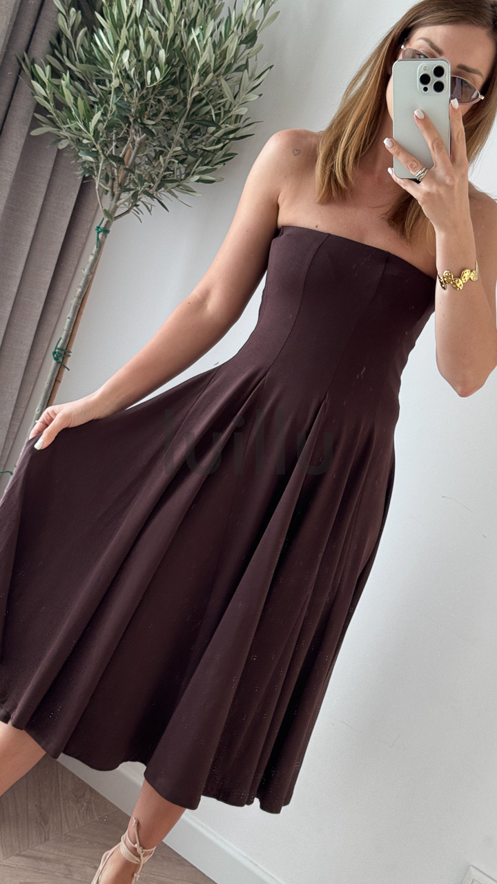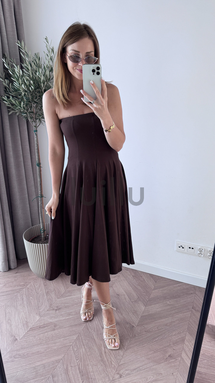Uszyta z 96% bawełny – czekoladowa sukienka rozkloszowana daje skórze oddychać i pięknie układa się w ruchu.