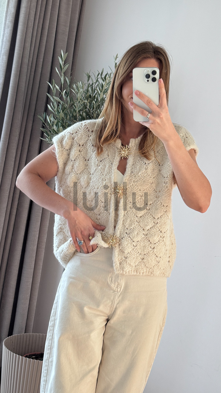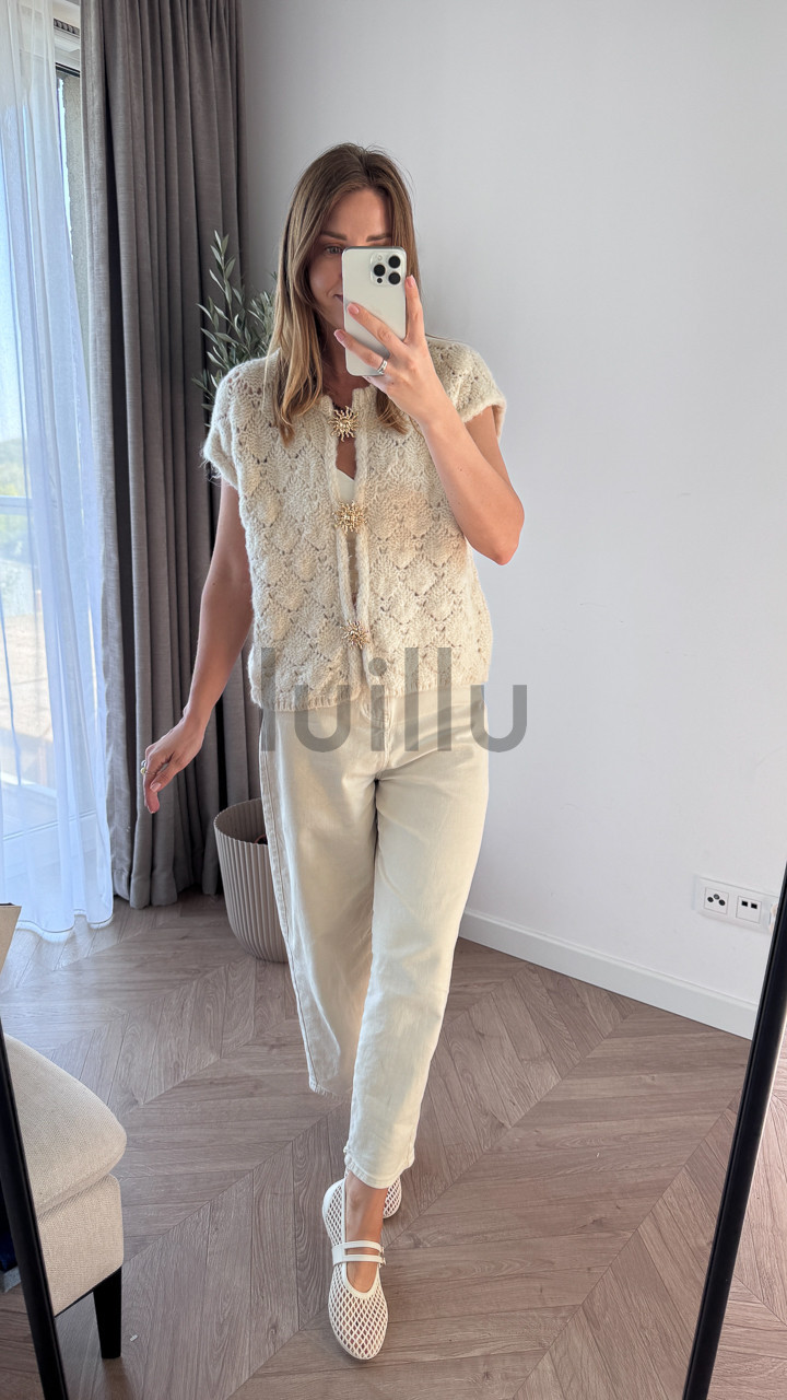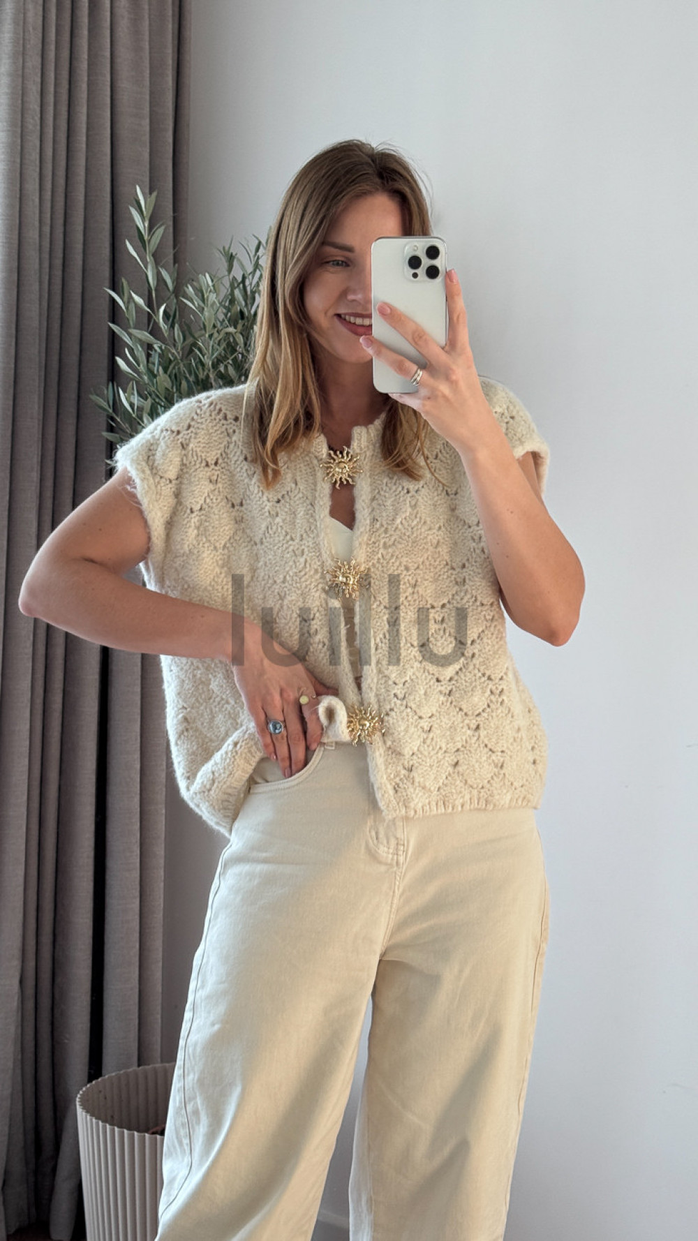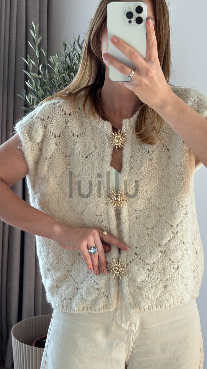 SWETER KAMIZELKA BEŻOWY ZE ZŁOTYMI APLIKACJAM SŁOŃCA