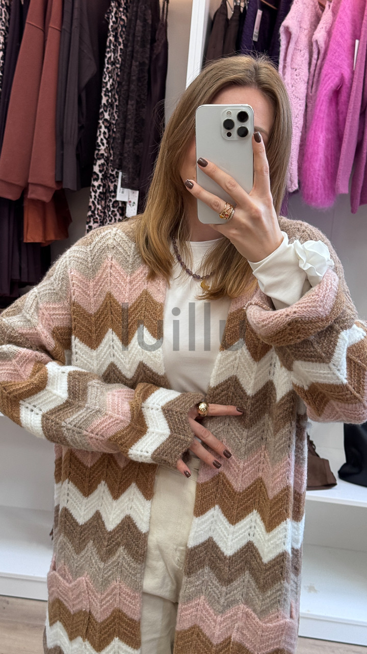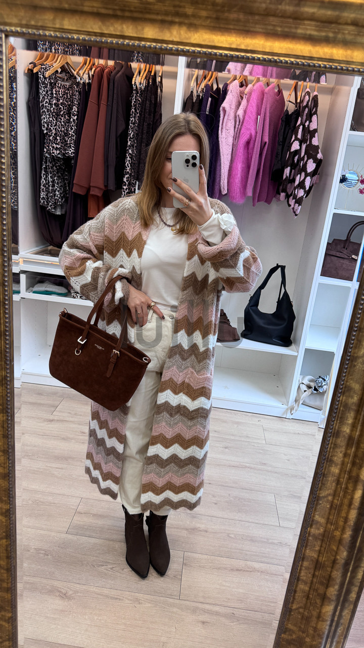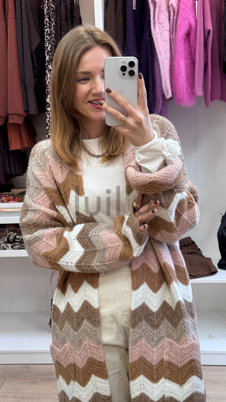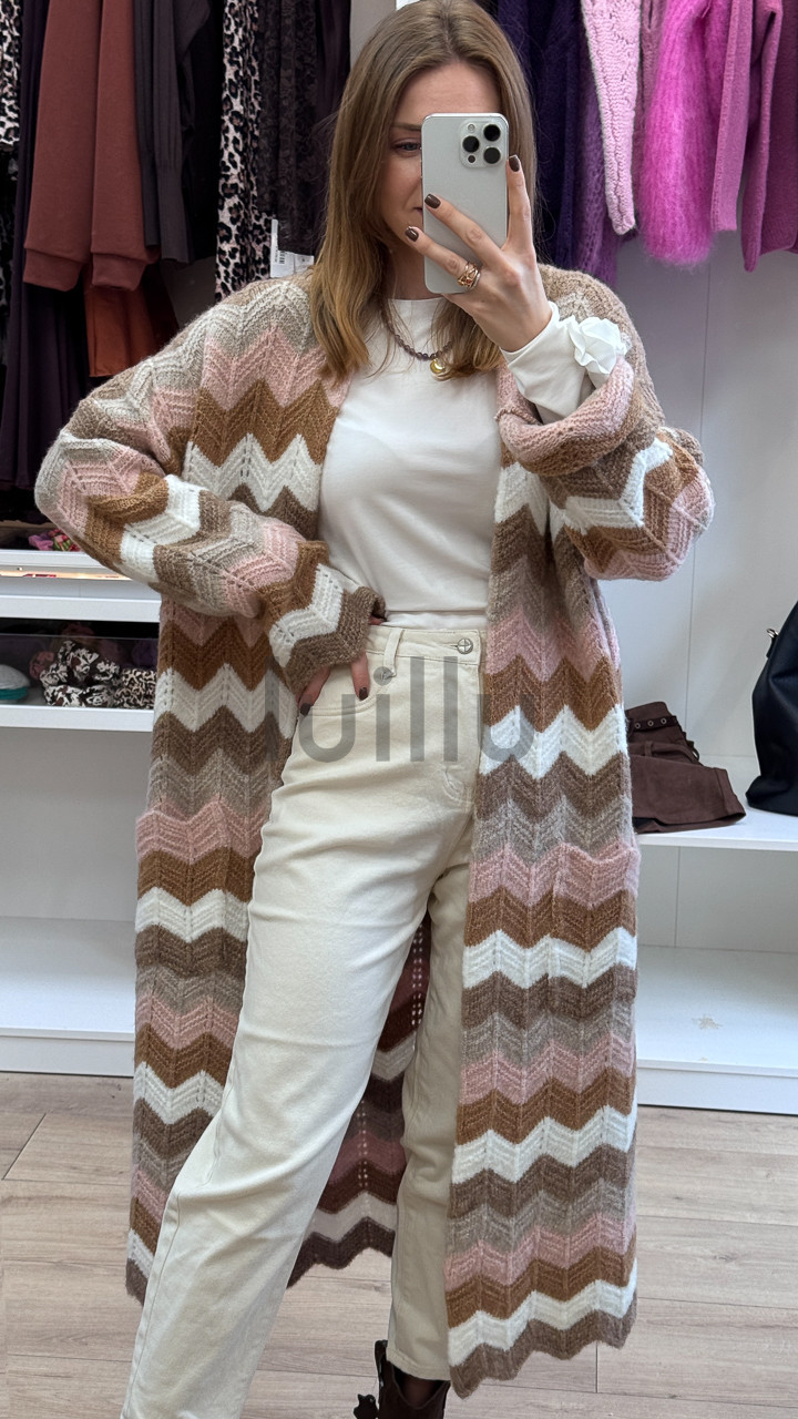 DŁUGI KARDIGAN Z KIESZENIAMI W KOLORACH KAKAO ECRU