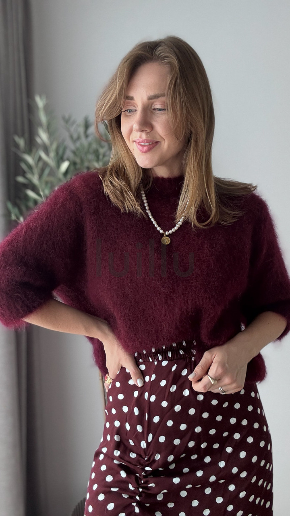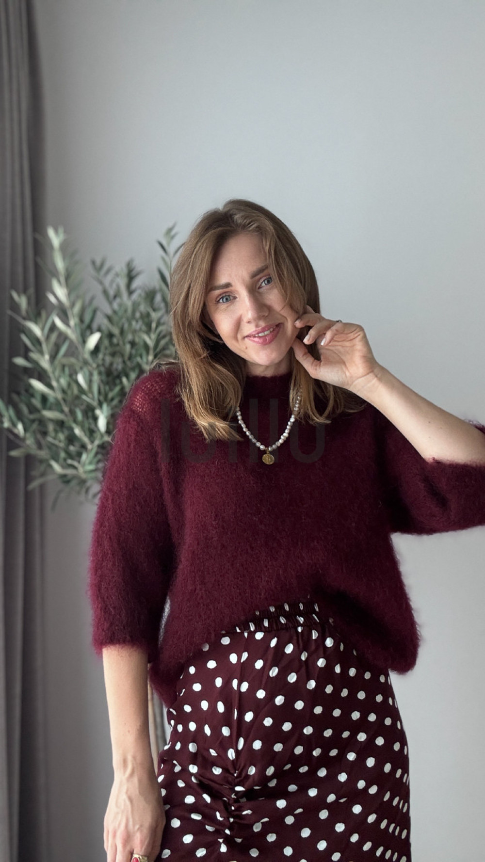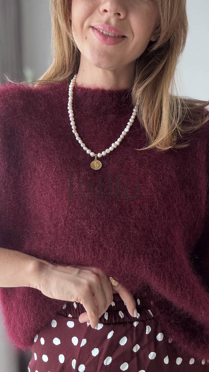 Ten burgundowy sweter z wełną kid moher otuli Cię miękkością i elegancją w chłodne poranki.