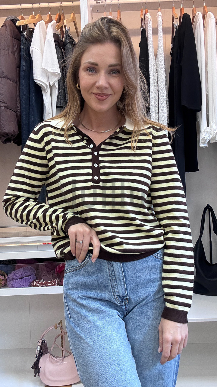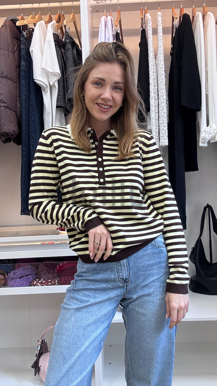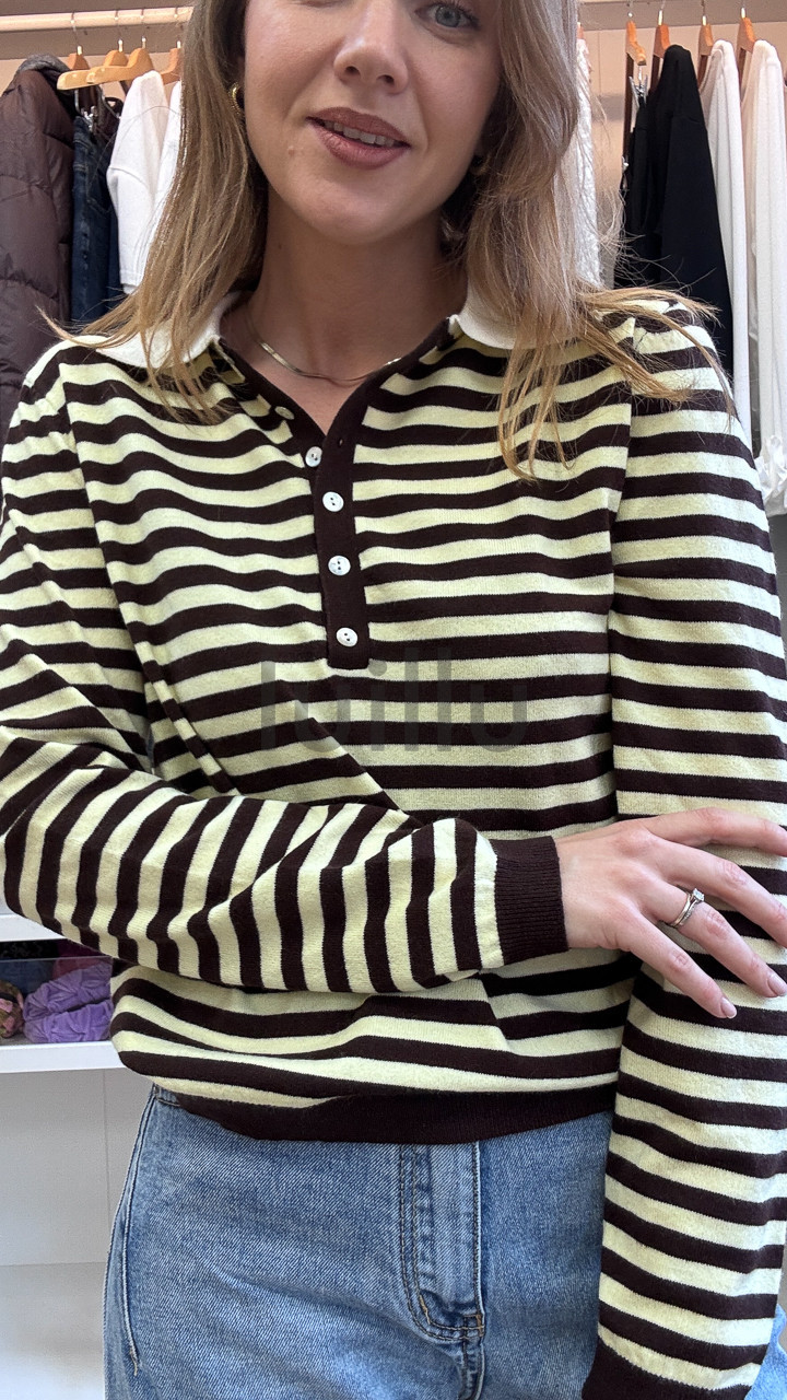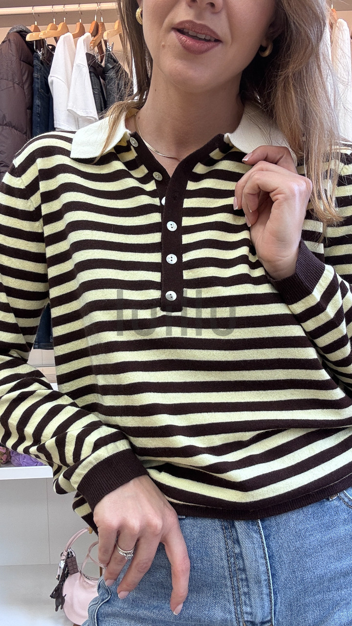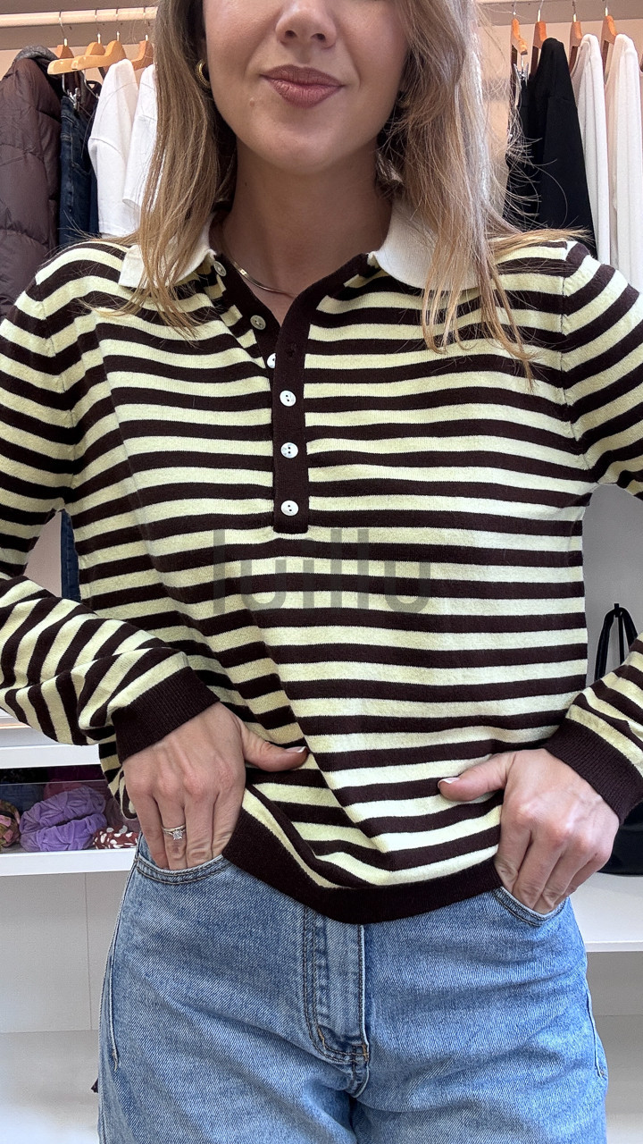 SWETER Z KOŁNIERZYKIEM POLO W PASKI CZEKOLADOWO BANANOWE