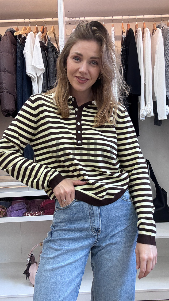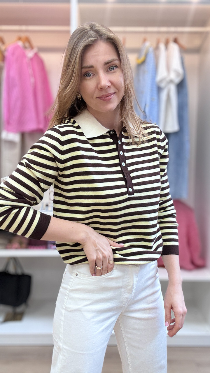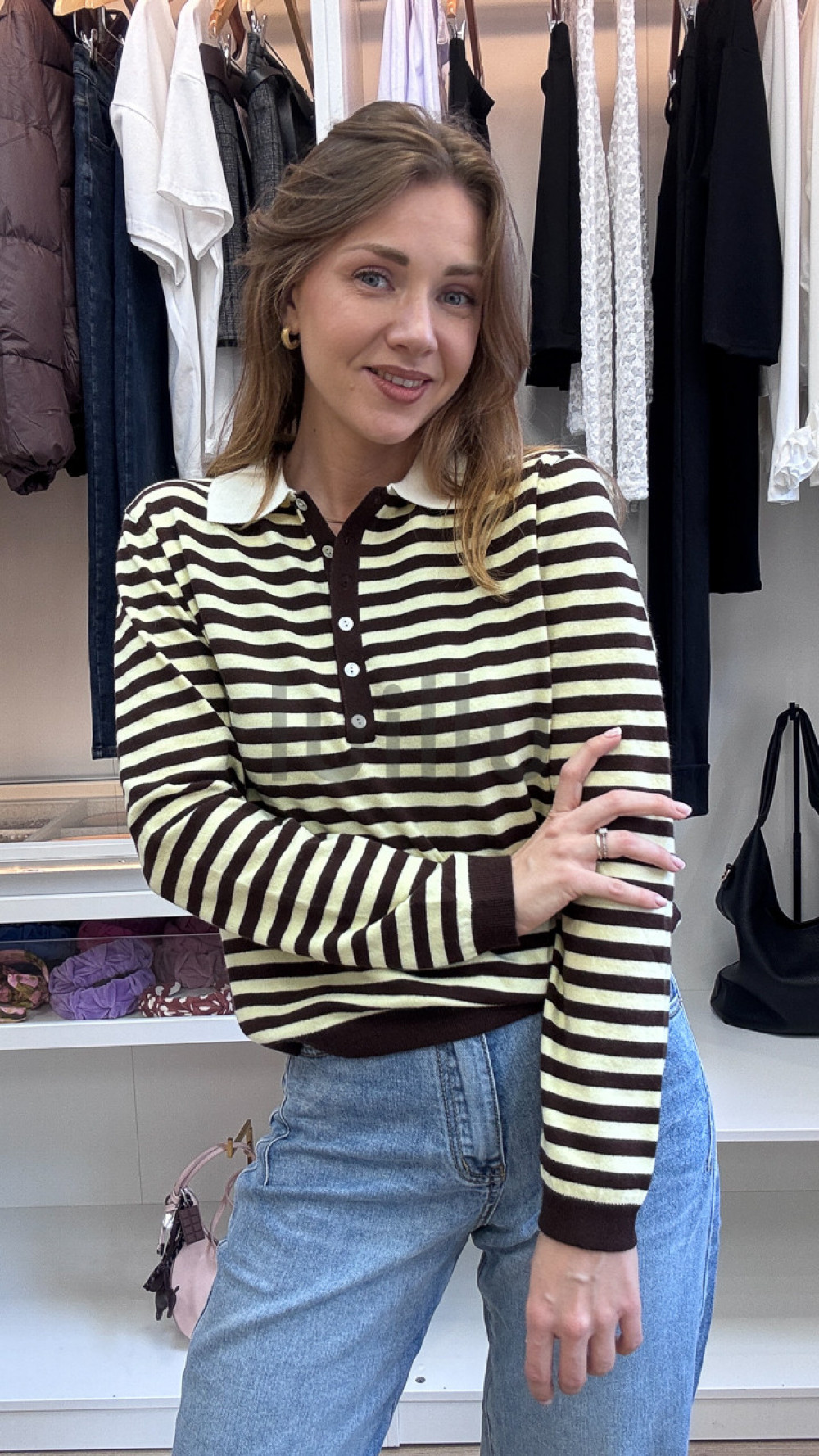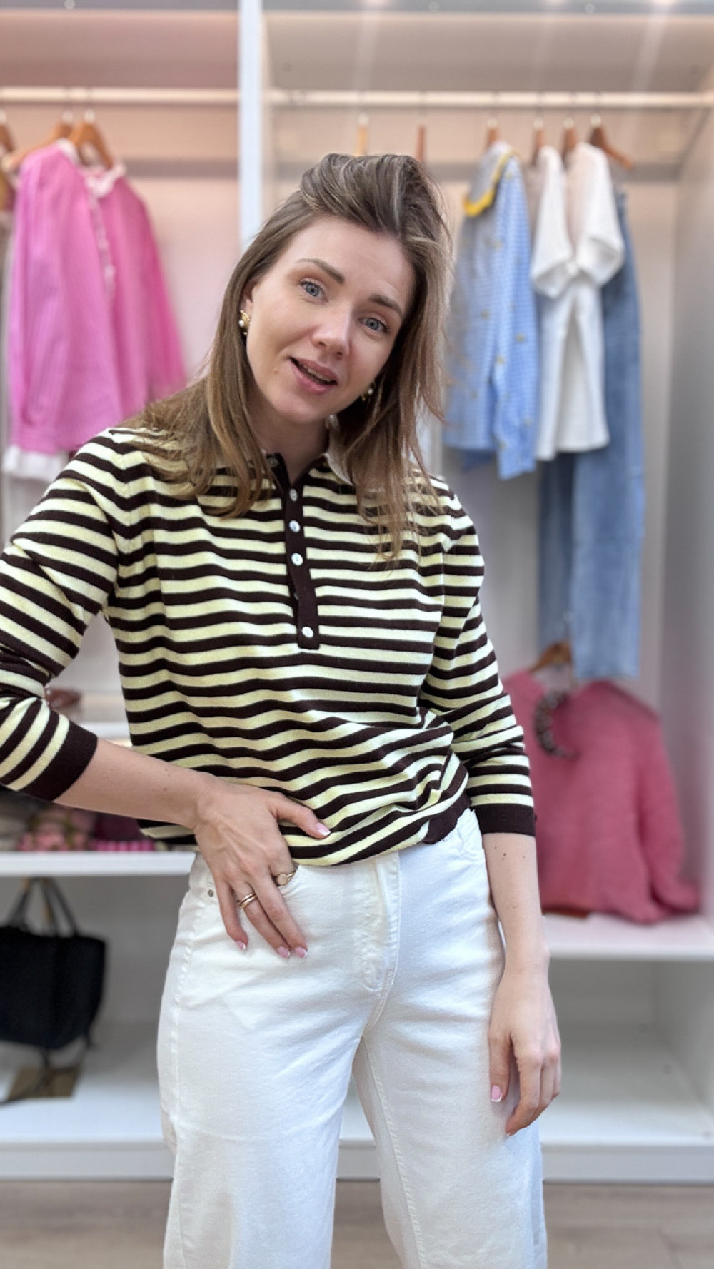 SWETER Z KOŁNIERZYKIEM POLO W PASKI CZEKOLADOWO BANANOWE