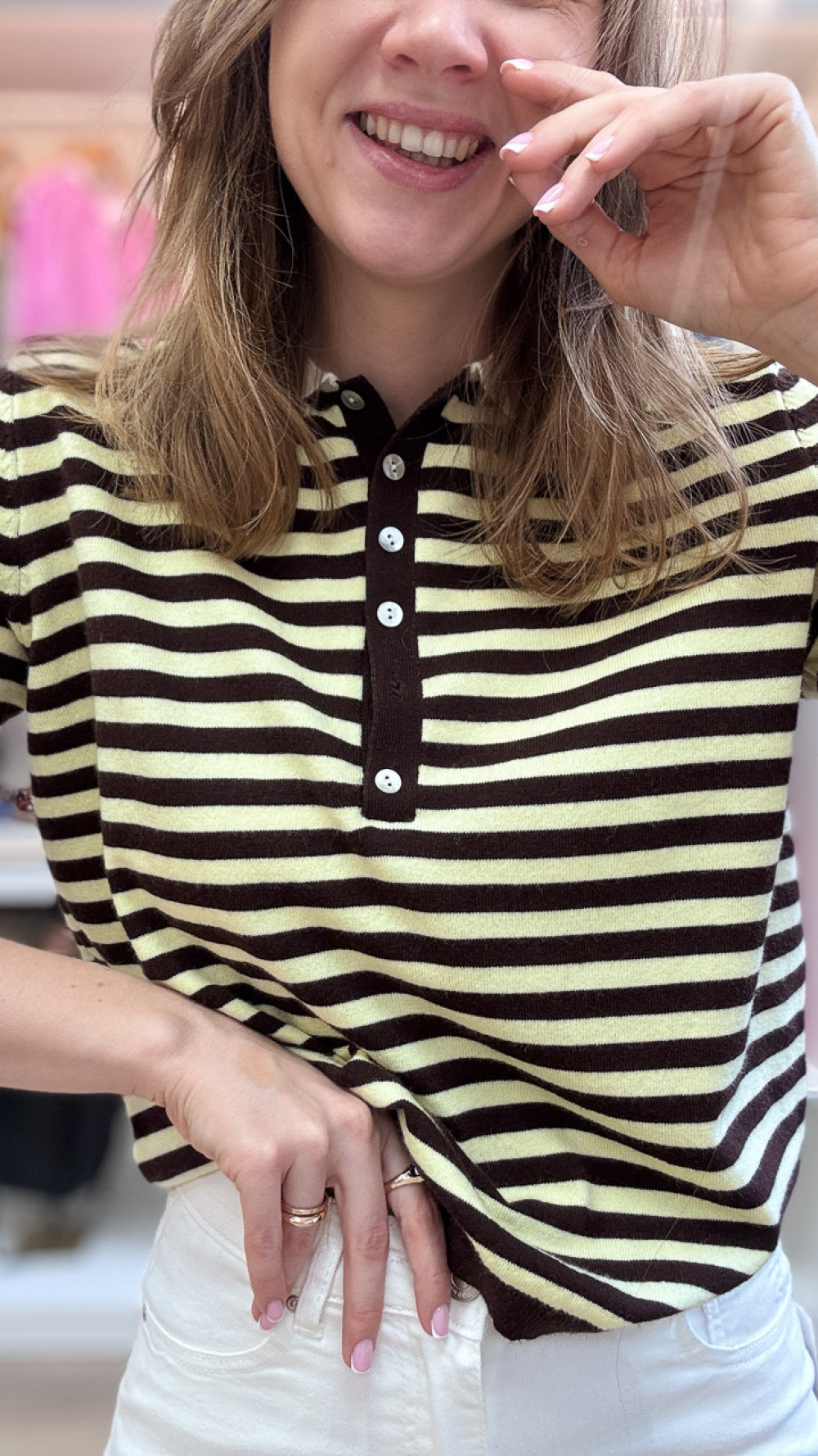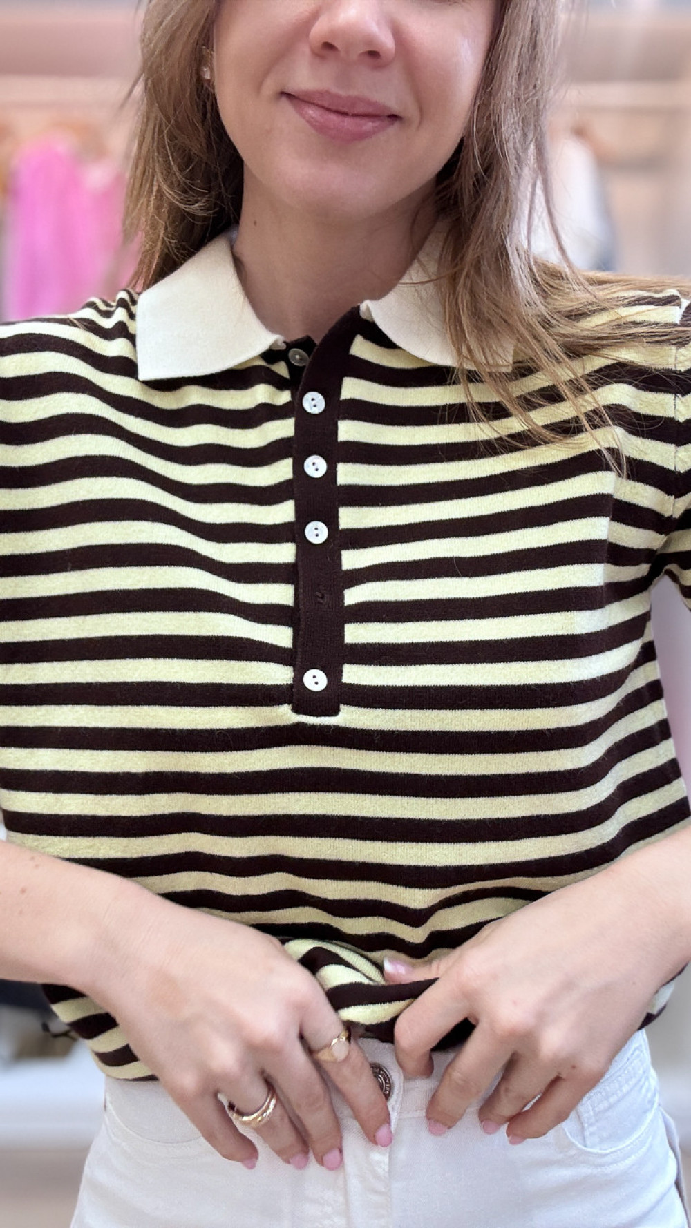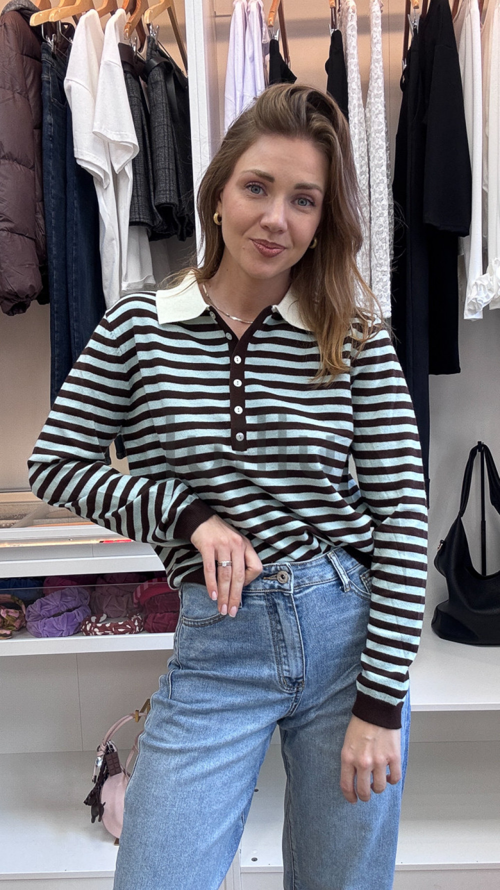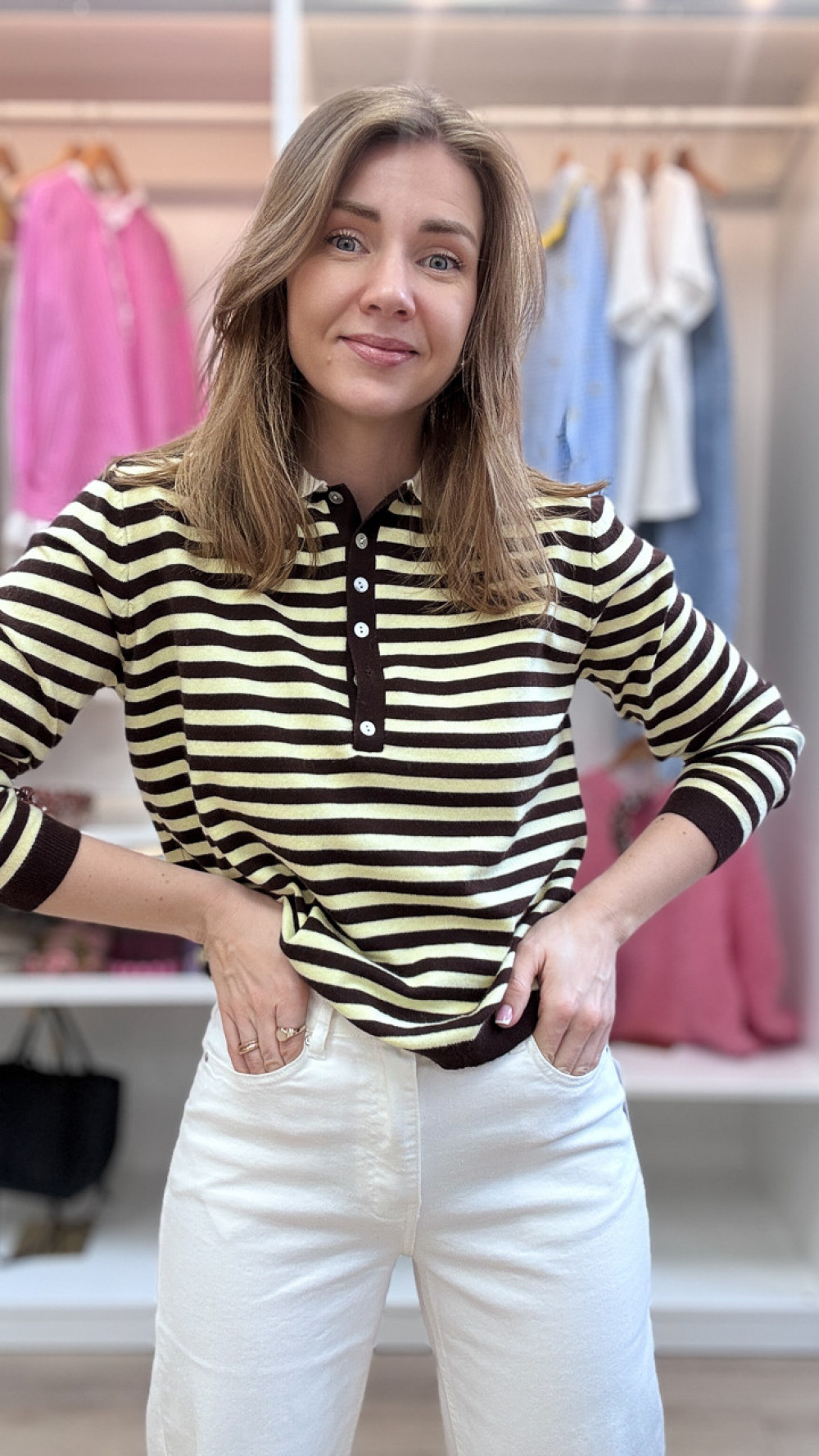 SWETER Z KOŁNIERZYKIEM POLO W PASKI CZEKOLADOWO BANANOWE