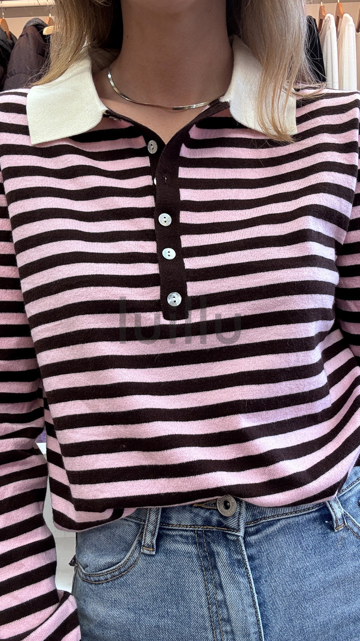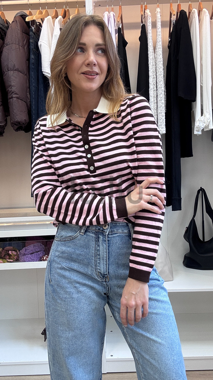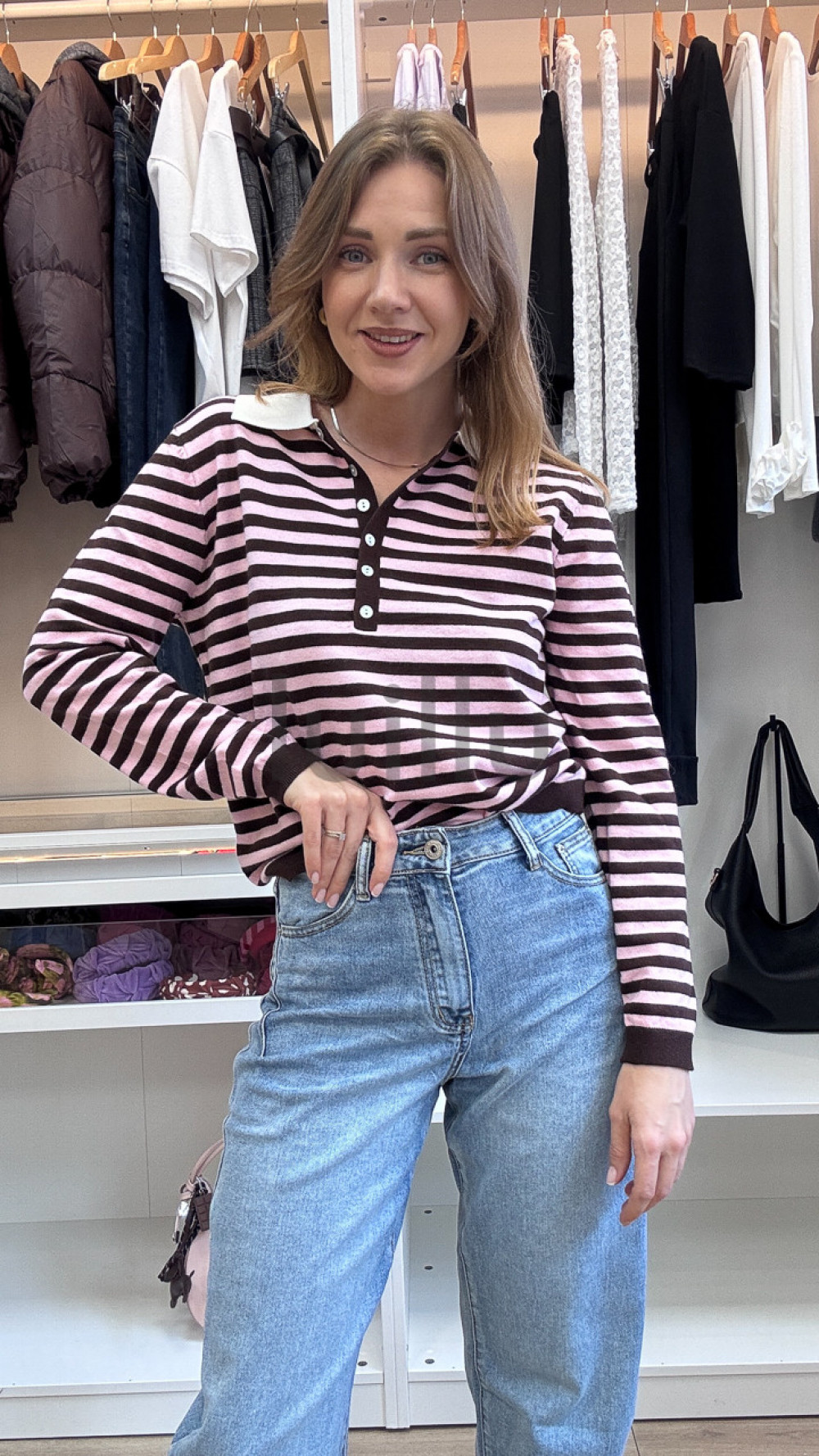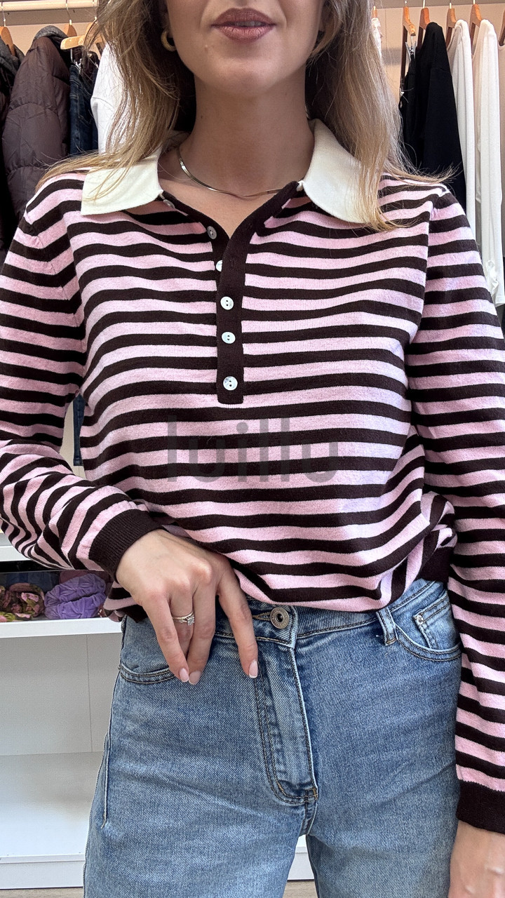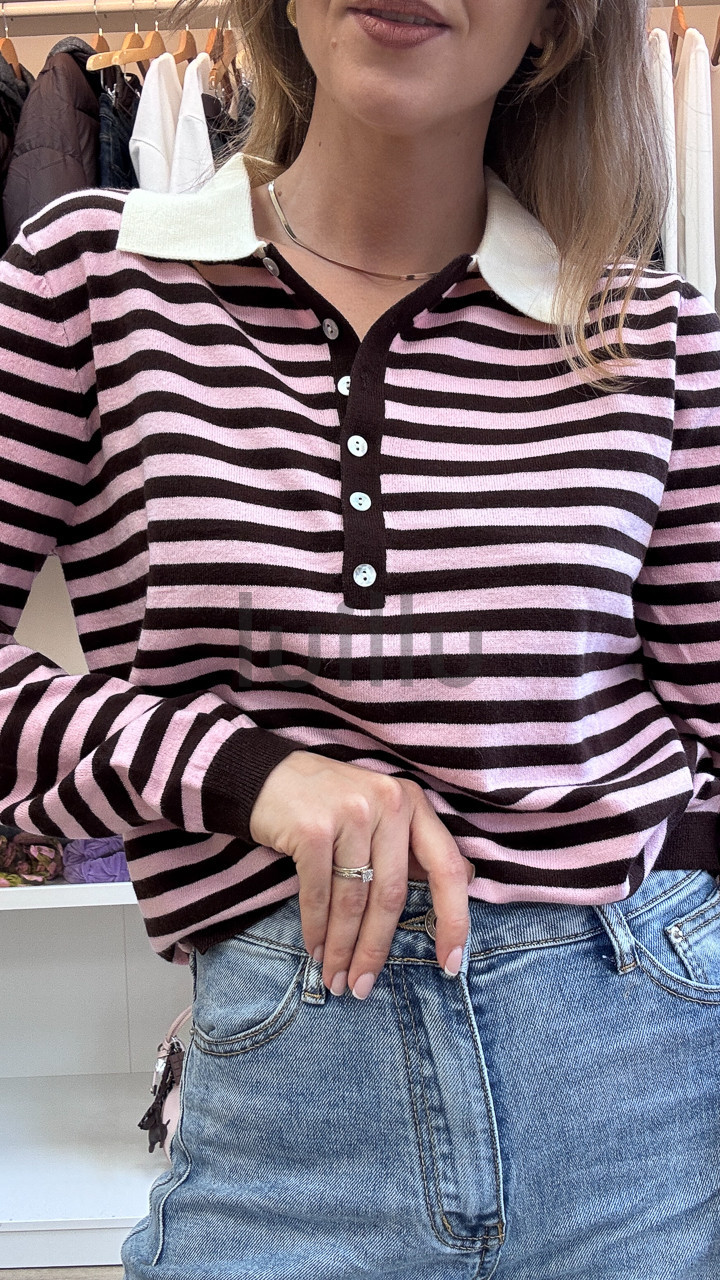SWETER Z KOŁNIERZYKIEM POLO W PASKI CZEKOLADOWO RÓŻOWE