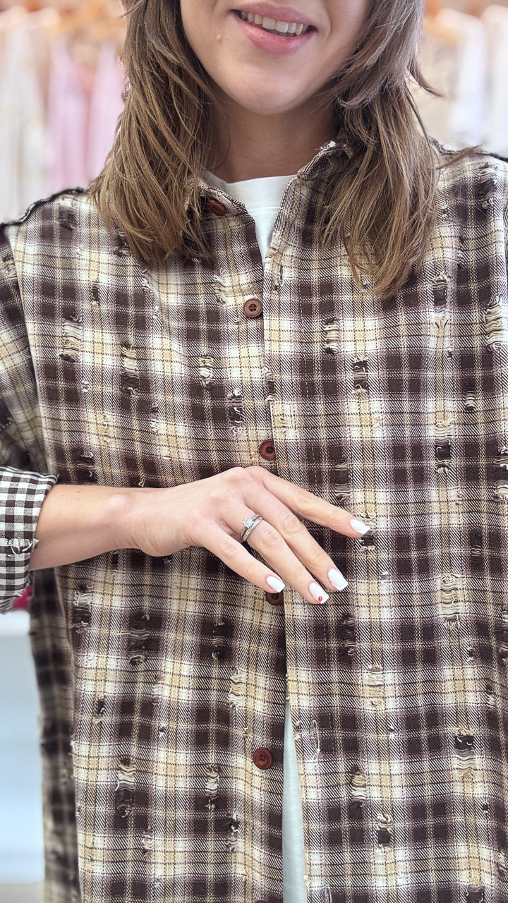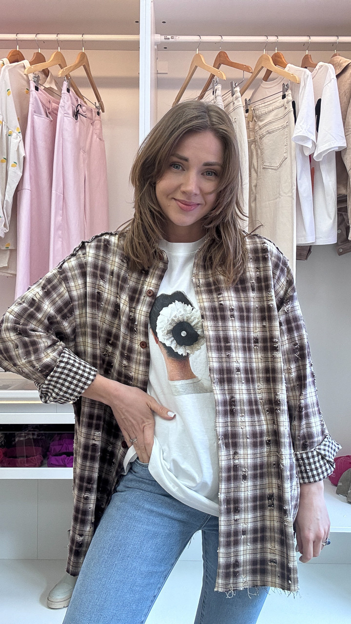 KOSZULA W KRATKĘ STZRĘPIONĄ CZEKOLADOWO BISZKOPTOWA