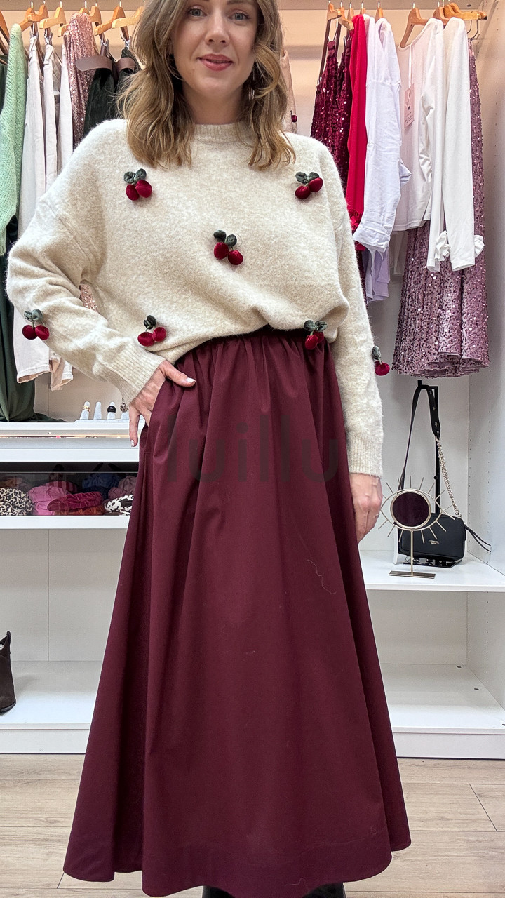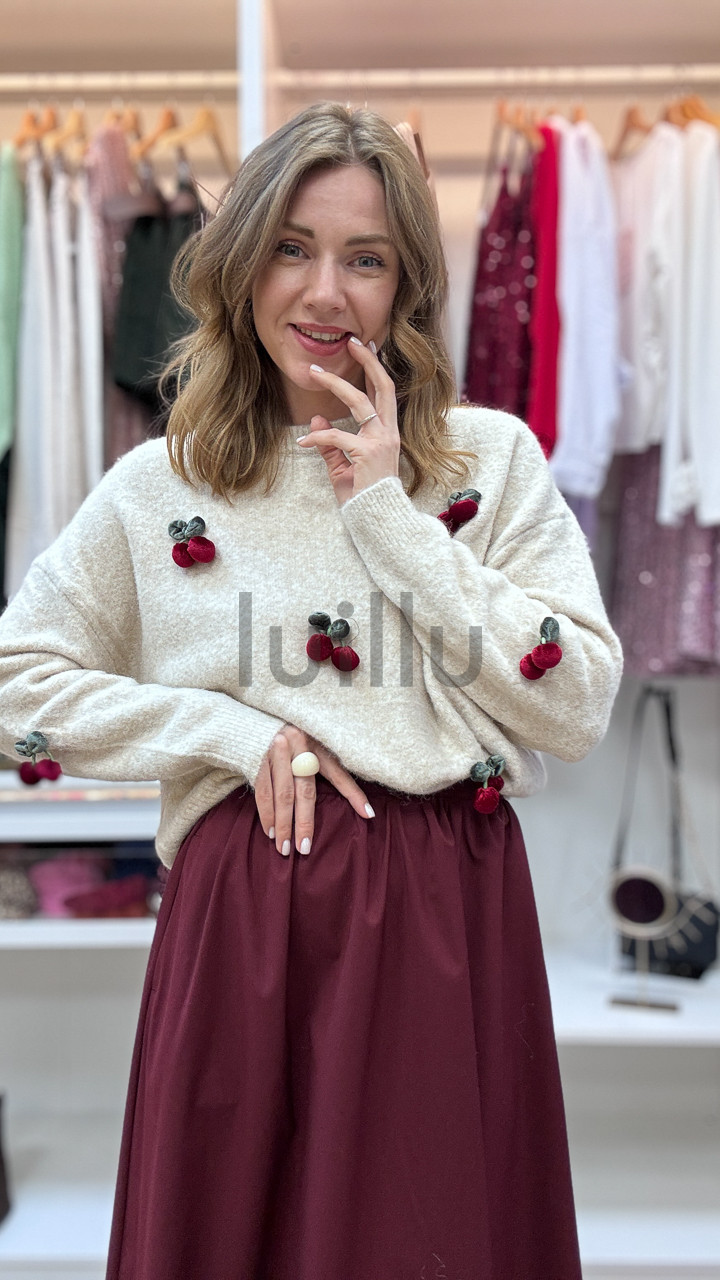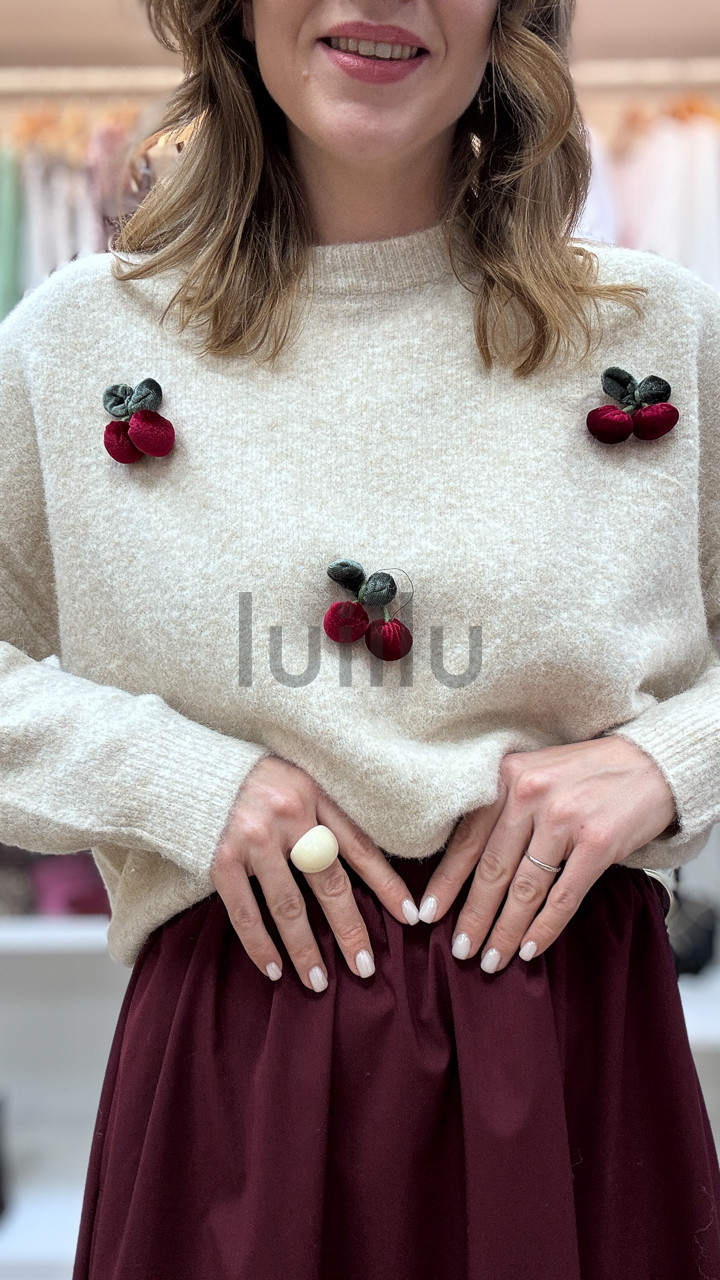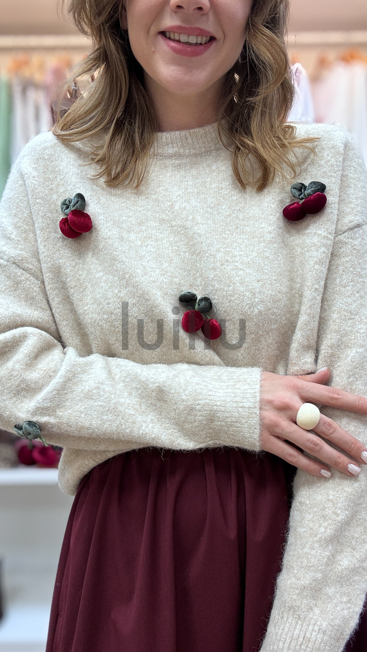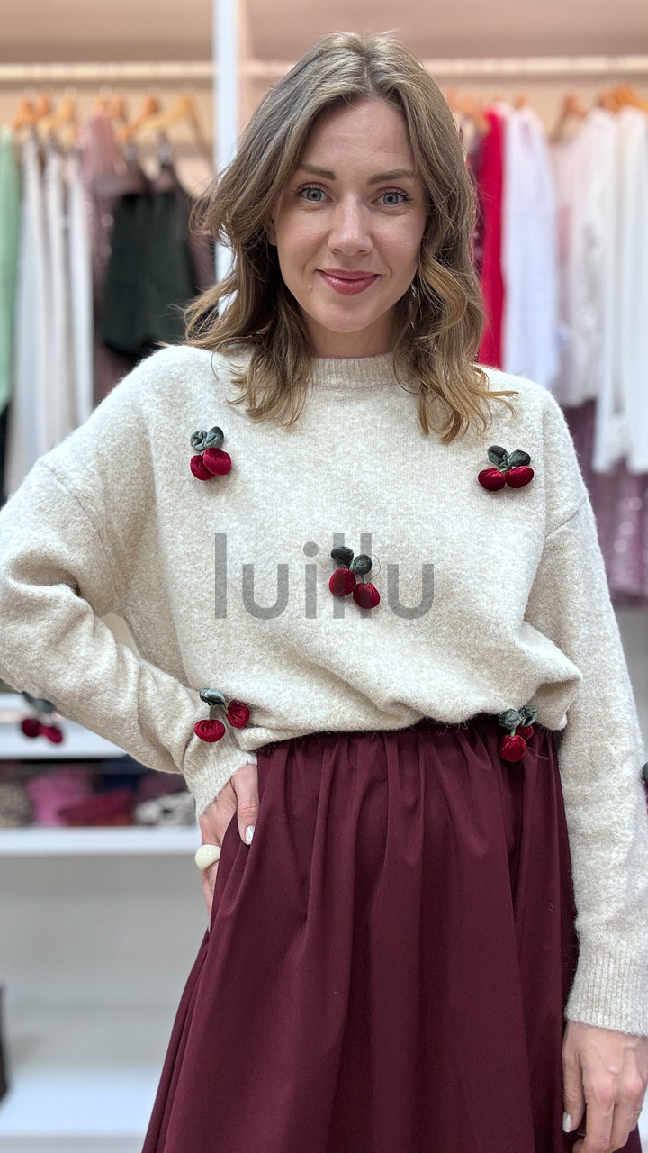 SWETER ŚMIETANKOWY Z APLIKACJAMI 3D WIŚNIA