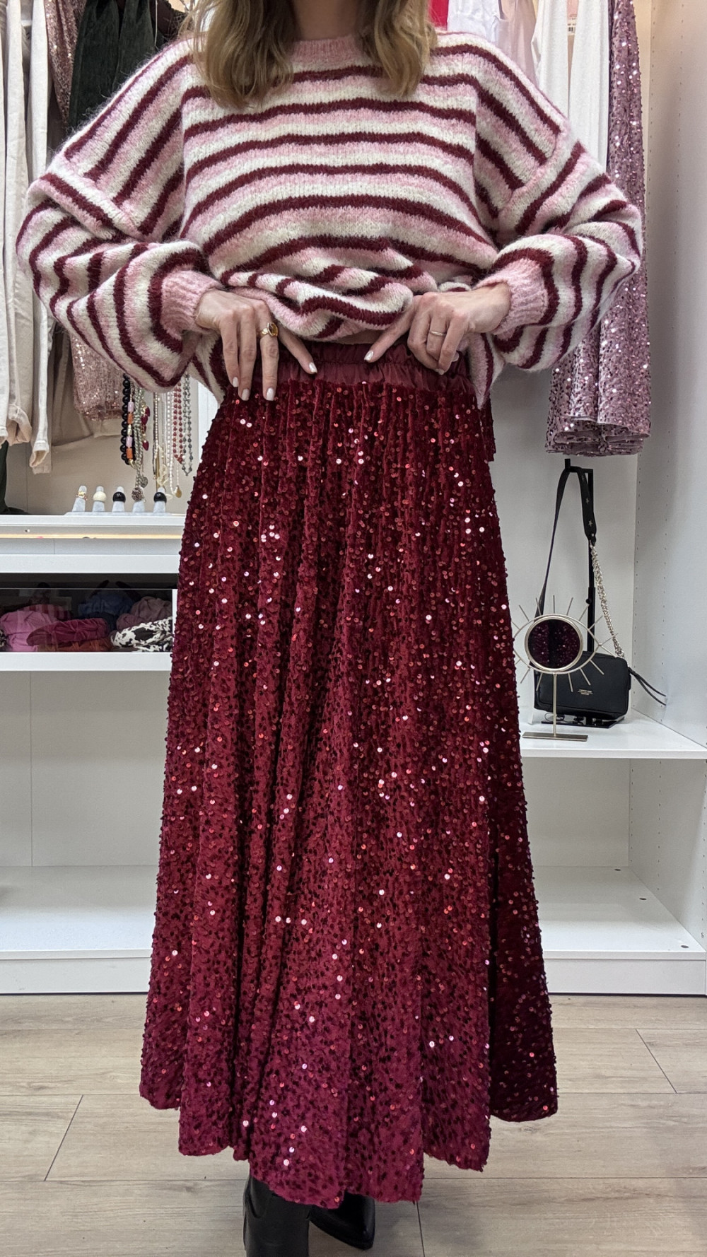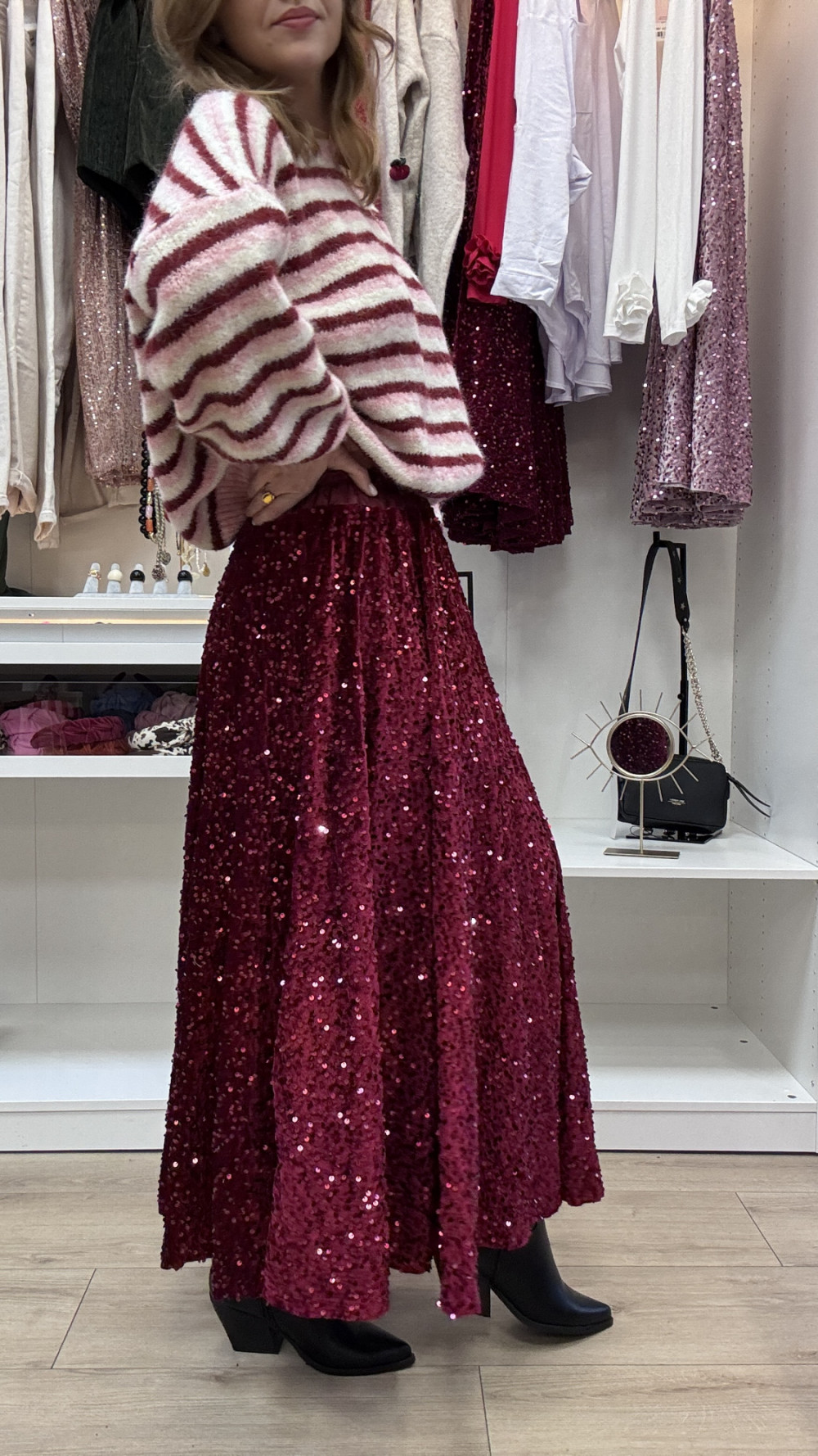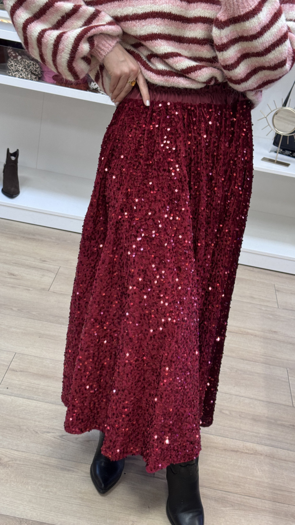 SPÓDNICA ROZKLOSZOWANA RUBINOWA WELUR Z CEKINEM STAR