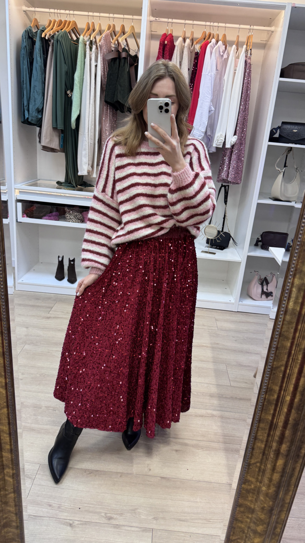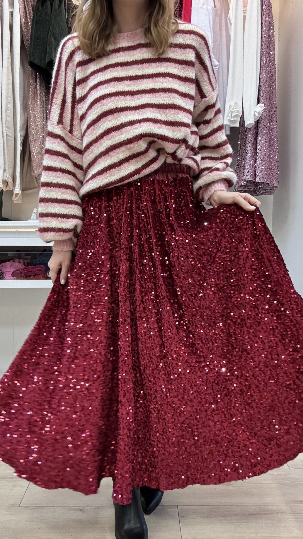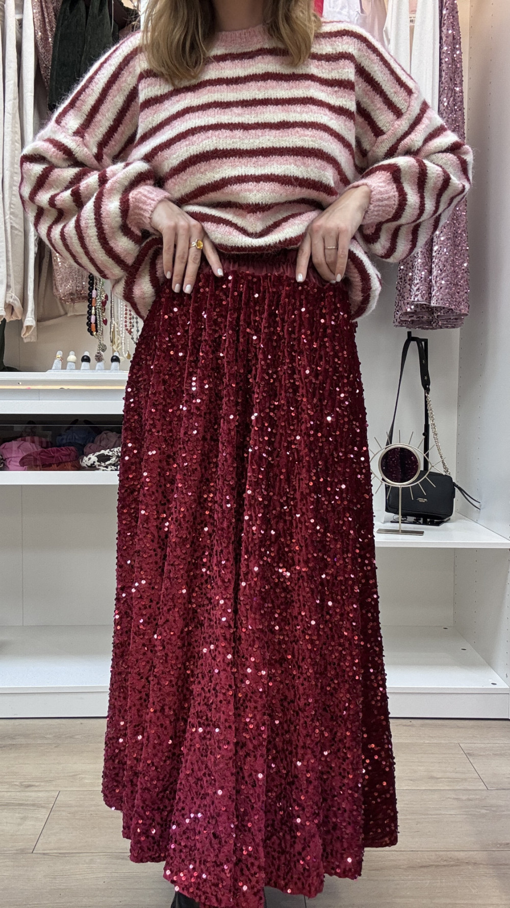 SPÓDNICA ROZKLOSZOWANA RUBINOWA WELUR Z CEKINEM STAR