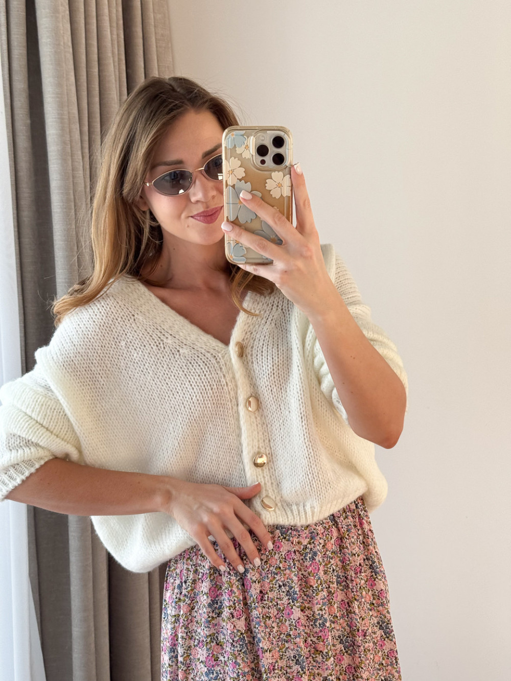Rozpinany pleciony sweter o oversizowym kroju ze złotym guzikiem to wyrafinowany i stylowy element garderoby.