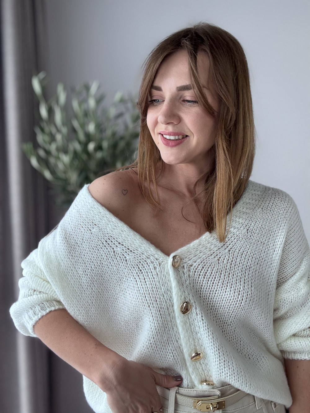 Złoty guzik jest ozdobnym akcentem, który dodaje elegancji i luksusu temu swetrowi.