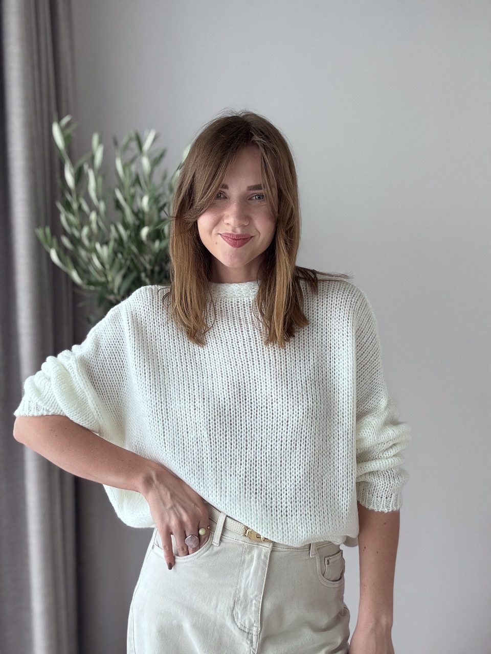 Ten sweter ma luźny, oversizowy fason, co oznacza, że jest nieco większy niż standardowe swetry.