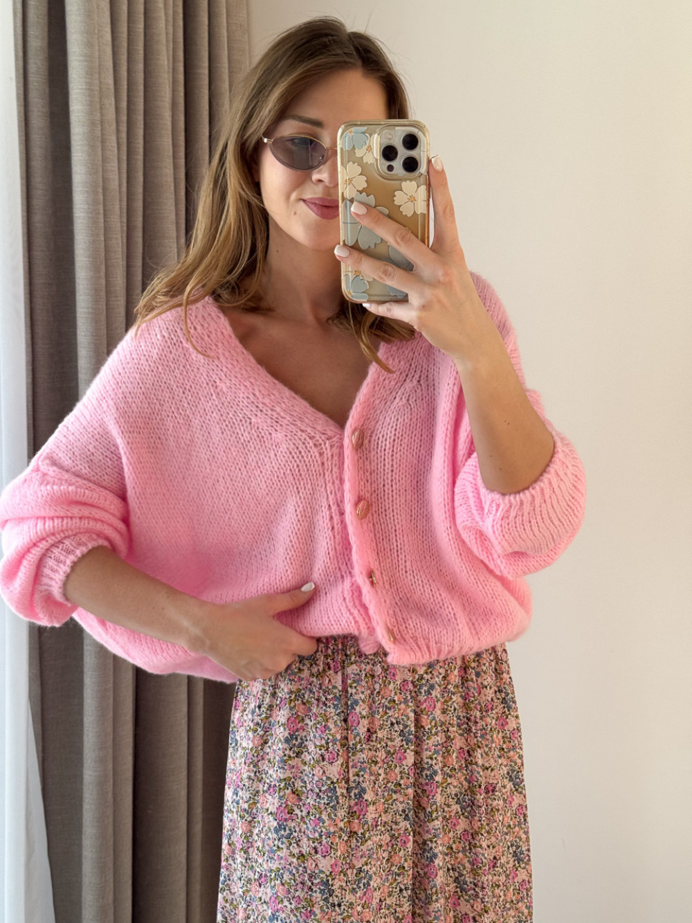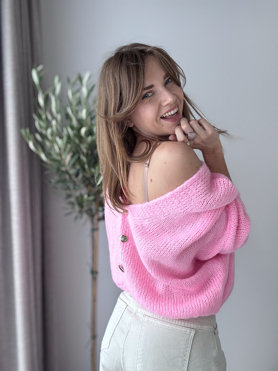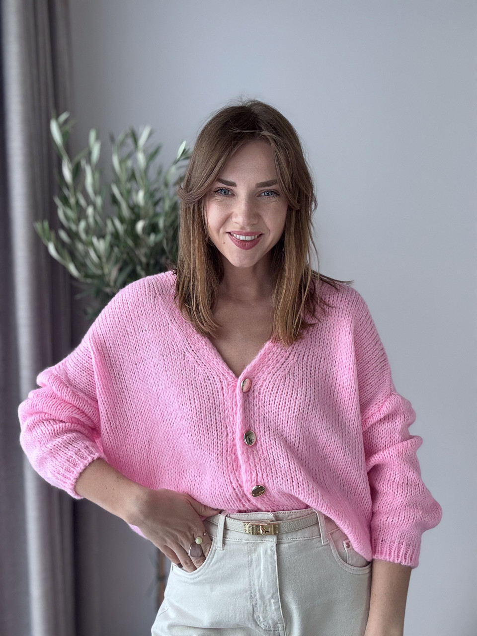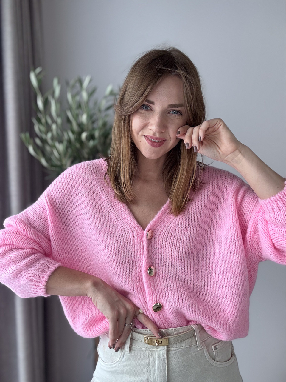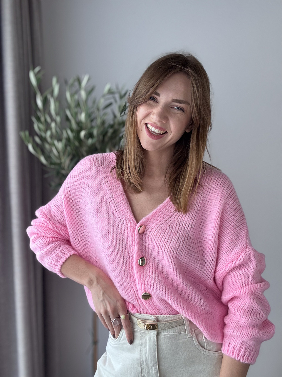 SWETER ROZPINANY PUDROWY RÓŻ, PUDEŁKOWY FASON Z OZDOBNYM GUZIKIEM LUKRECJA