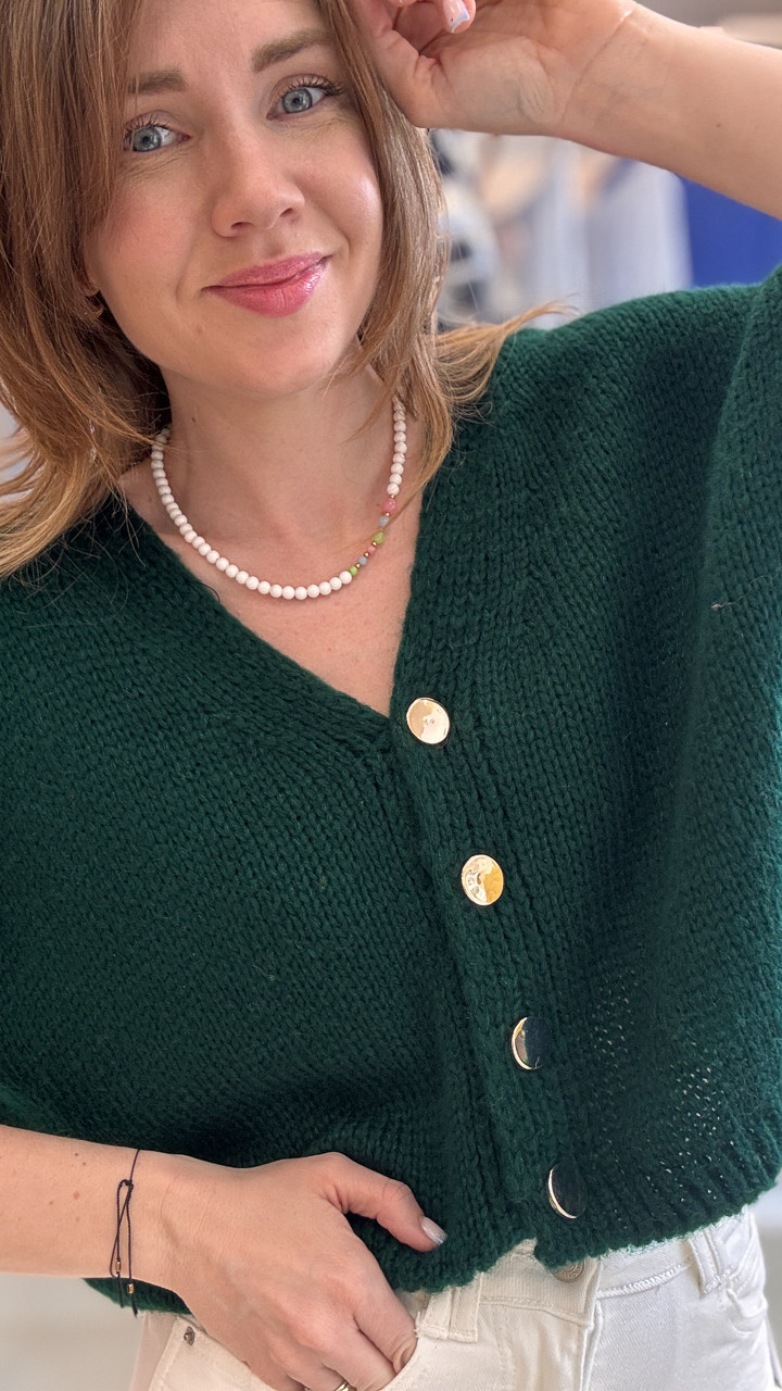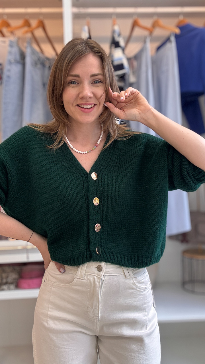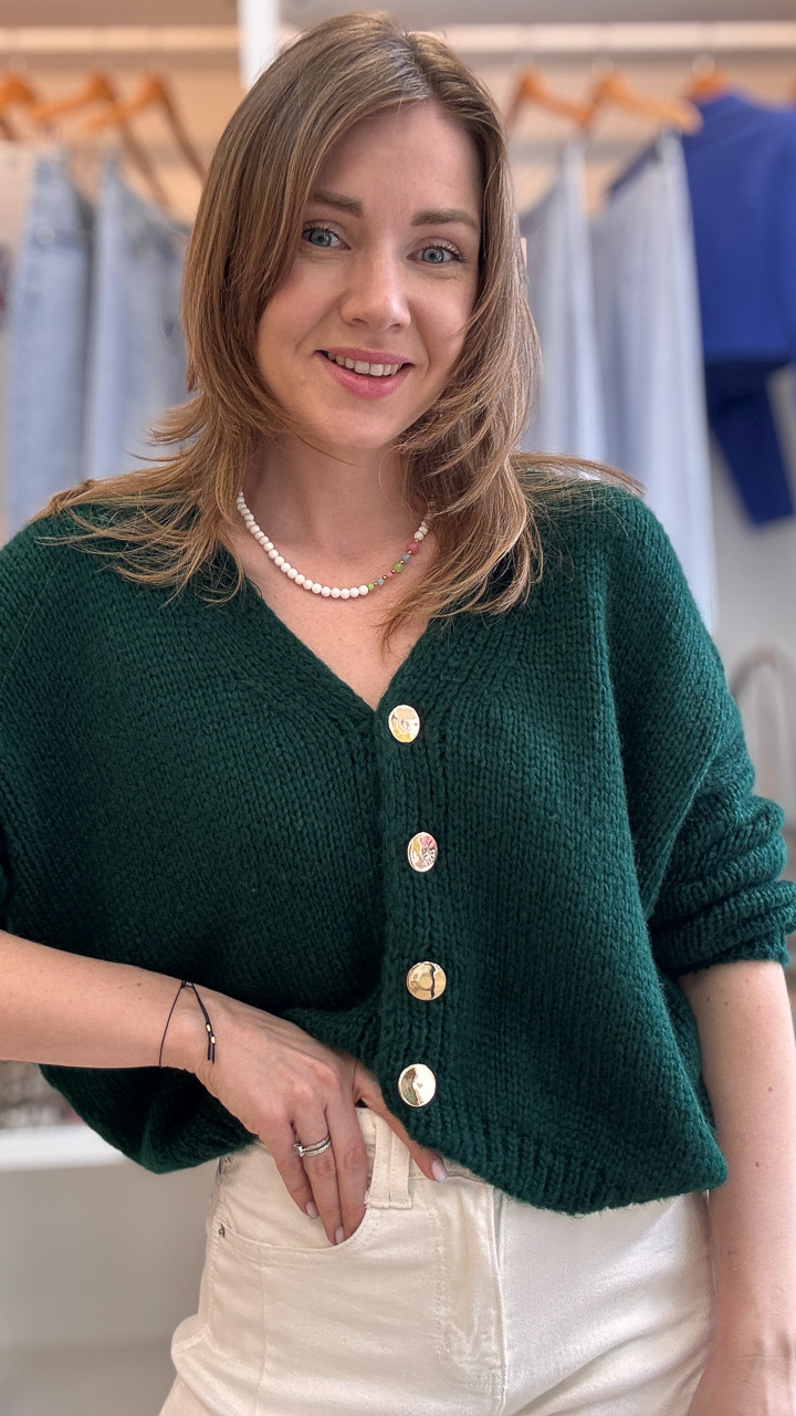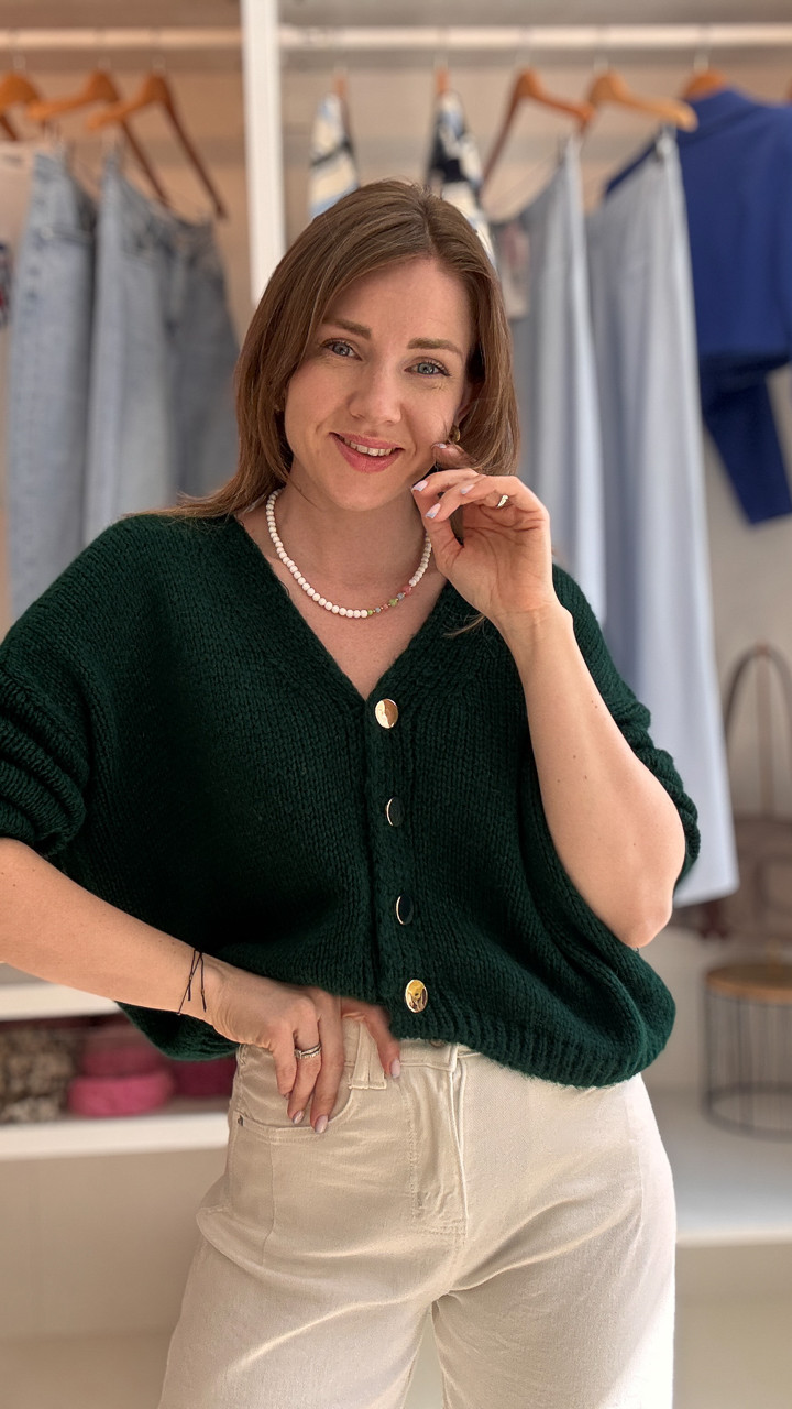SWETER ROZPINANY BUTELKOWA ZIELEŃ, PUDEŁKOWY FASON Z OZDOBNYM GUZIKIEM LUKRECJA